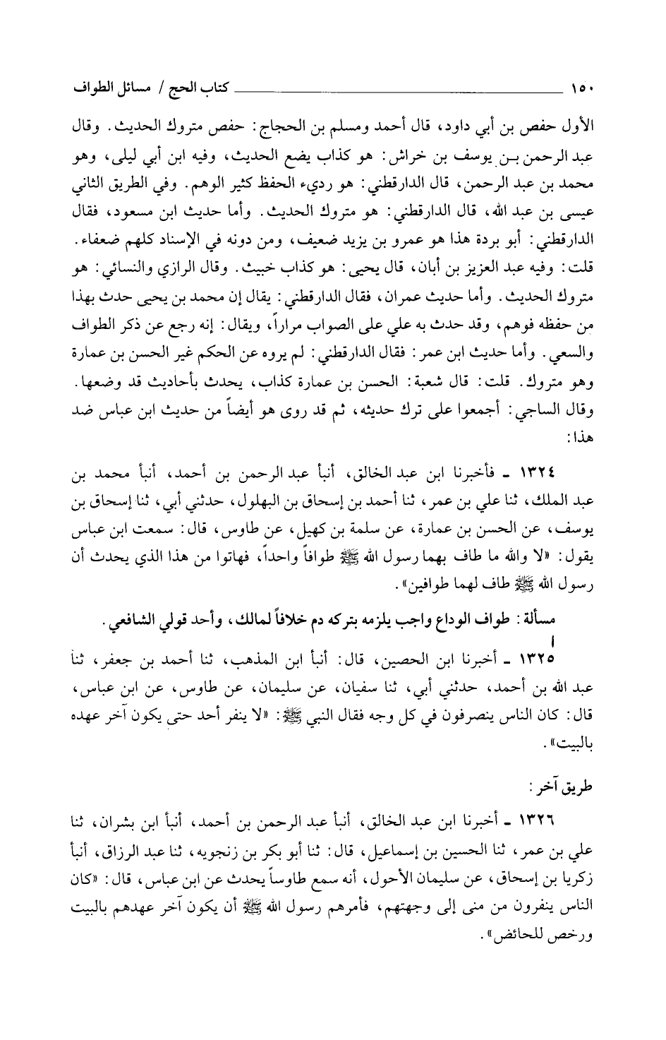 1325 - أَخْبَرَنَا ابْنُ الْحُصَيْنِ قَالَ أَنْبَأَ ابْنُ الْمَذْهَب ثَنَا أَحْمد بن جَعْفَر ثَنَا عَبْدُ اللَّهِ بْنُ أَحْمَدَ حَدَّثَنِي أبي ثَنَا سُفْيَانُ عَنْ سُلَيْمَانَ عَنْ طَاوُسٍ عَنِ ابْنِ عَبَّاسٍ قَالَ كَانَ النَّاسُ يَنْصَرِفُونَ فِي كُلِّ وَجْهٍ فَقَالَ النَّبِيُّ صَلَّى اللَّهُ عَلَيْهِ وَسَلَّمَ لَا يَنْفِرْ أَحَدٌ حَتَّى يَكُونَ آخَرُ عَهْدِهِ بِالْبَيْتِ