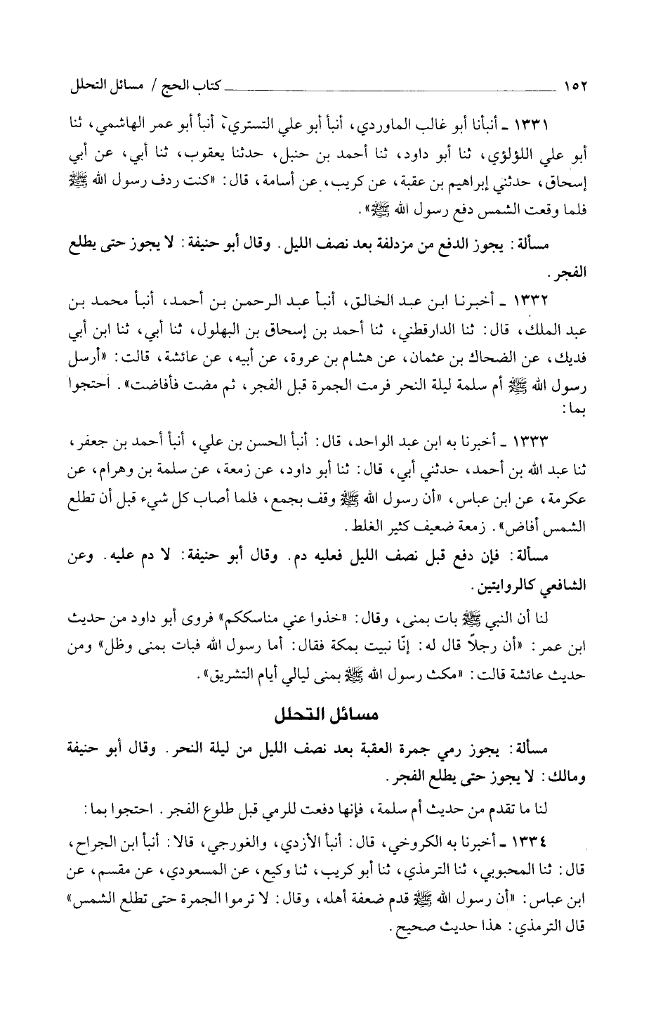 1331 - أَنْبَأَنَا أَبُو غَالِبٍ الْمَاوَرْدِيُّ أَنْبَأَ أَبُو عَلِيٍّ التُّسْتَرِيُّ أَنْبَأَ أَبُو عُمَرَ الْهَاشِمِي ثَنَا أَبُو عَليّ اللؤْلُؤِي ثَنَا أَبُو دَاوُد ثَنَا أَحْمَدُ بْنُ حَنْبَلٍ حَدَّثَنَا يَعْقُوبُ ثَنَا أَبِي عَنْ أَبِي إِسْحَاقَ حَدَّثَنِي إِبْرَاهِيمَ بْنِ عُقْبَةَ عَنْ كُرَيْبٍ عَنْ أُسَامَةَ قَالَ كُنْتُ رِدْفَ رَسُولُ اللَّهِ صَلَّى اللَّهُ عَلَيْهِ وَسَلَّمَ فَلَمَّا وَقَعَتِ الشَّمْسِ دَفَعَ رَسُولُ اللَّهِ صَلَّى اللَّهُ عَلَيْهِ وَسَلَّمَ