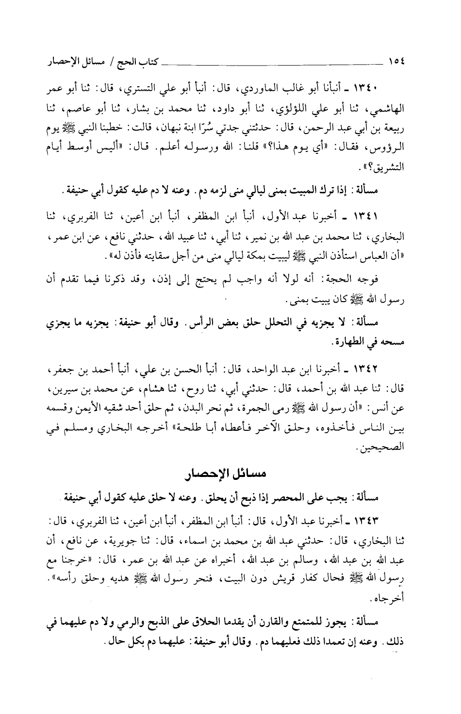1341 - أَخْبَرَنَا عَبْدُ الْأَوَّلِ أَنْبَأَ ابْنُ الْمُظَفَّرِ أنبأ ابْن أعين ثَنَا الْفربرِي ثَنَا البُخَارِيّ ثَنَا مُحَمَّدُ بْنُ عَبْدِ اللَّهِ بْنِ نمير ثَنَا أبي ثَنَا عُبَيْدُ اللَّهِ حَدَّثَنِي نَافِعٌ عَنِ ابْنِ عُمَرَ أَنَّ الْعَبَّاسَ اسْتَأْذَنَ النَّبِيَّ صَلَّى اللَّهُ عَلَيْهِ وَسَلَّمَ لِيَبِيتَ بِمَكَّةَ لَيَالِي مِنَى مِنْ أَجْلِ سِقَايَتِهِ فَأَذِنَ لَهُ فَوَجْهُ الْحُجَّةِ أَنَّهُ لَوْلَا أَنَّهُ وَاجِبٌ لَمْ يُحْتَجْ إِلَى إِذْنٍ وَقَدْ ذَكَرْنَا فِيمَا تَقَدَّمَ أَنَّ رَسُولَ اللَّهِ صَلَّى اللَّهُ عَلَيْهِ وَسَلَّمَ كَانَ يَبِيتُ بِمِنى