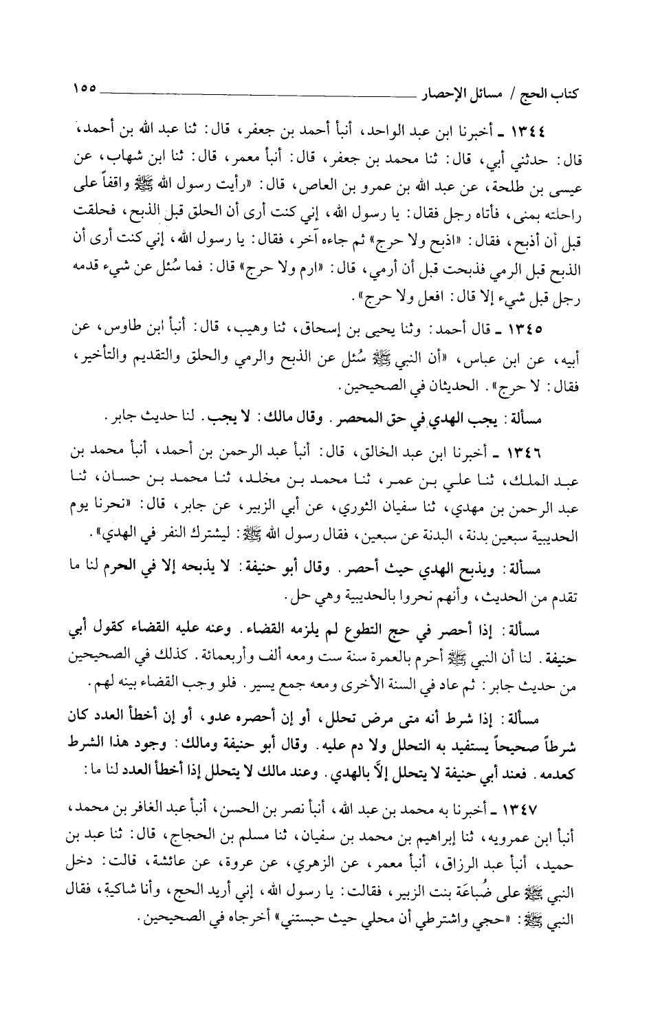 1347 - أَخْبَرَنَا بِهِ مُحَمَّدُ بْنُ عَبْدِ اللَّهِ أَنْبَأَ نَصْرُ بْنُ الْحَسَنِ أَنْبَأَ عَبْدُ الْغَافِرِ بْنُ مُحَمَّدٍ أَنْبَأَ ابْنُ عمرويه ثَنَا إِبْرَاهِيمُ بْنُ مُحَمَّدٍ بْنِ سُفْيَانَ ثَنَا مُسلم بن الْحجَّاج قَالَ ثَنَا عبد بن حميد أنبأ عَبْدُ الْرَّزَّاقِ أَنْبَأَ مَعْمَرٌ عَنْ الزُّهْرِيِّ عَنْ عُرْوَةَ عَنْ عَائِشَةَ قَالَتْ دَخَلَ النَّبِيُّ صَلَّى اللَّهُ عَلَيْهِ وَسَلَّمَ عَلَى ضُبَاعَةَ بِنْتِ الزُّبَيْرِ فَقَالَتْ يَا رَسُولَ اللَّهِ إِنِّي أُرِيدُ الْحَجَّ وَأَنَا شَاكِيَةٌ فَقَالَ النَّبِيُّ صَلَّى اللَّهُ عَلَيْهِ وَسَلَّمَ حُجِّي وَاشْتَرِطِي أَنَّ مَحِلِّي حَيْثُ حَبَسْتَنِي أَخْرَجَاهُ فِي الصَّحِيحَيْنِ