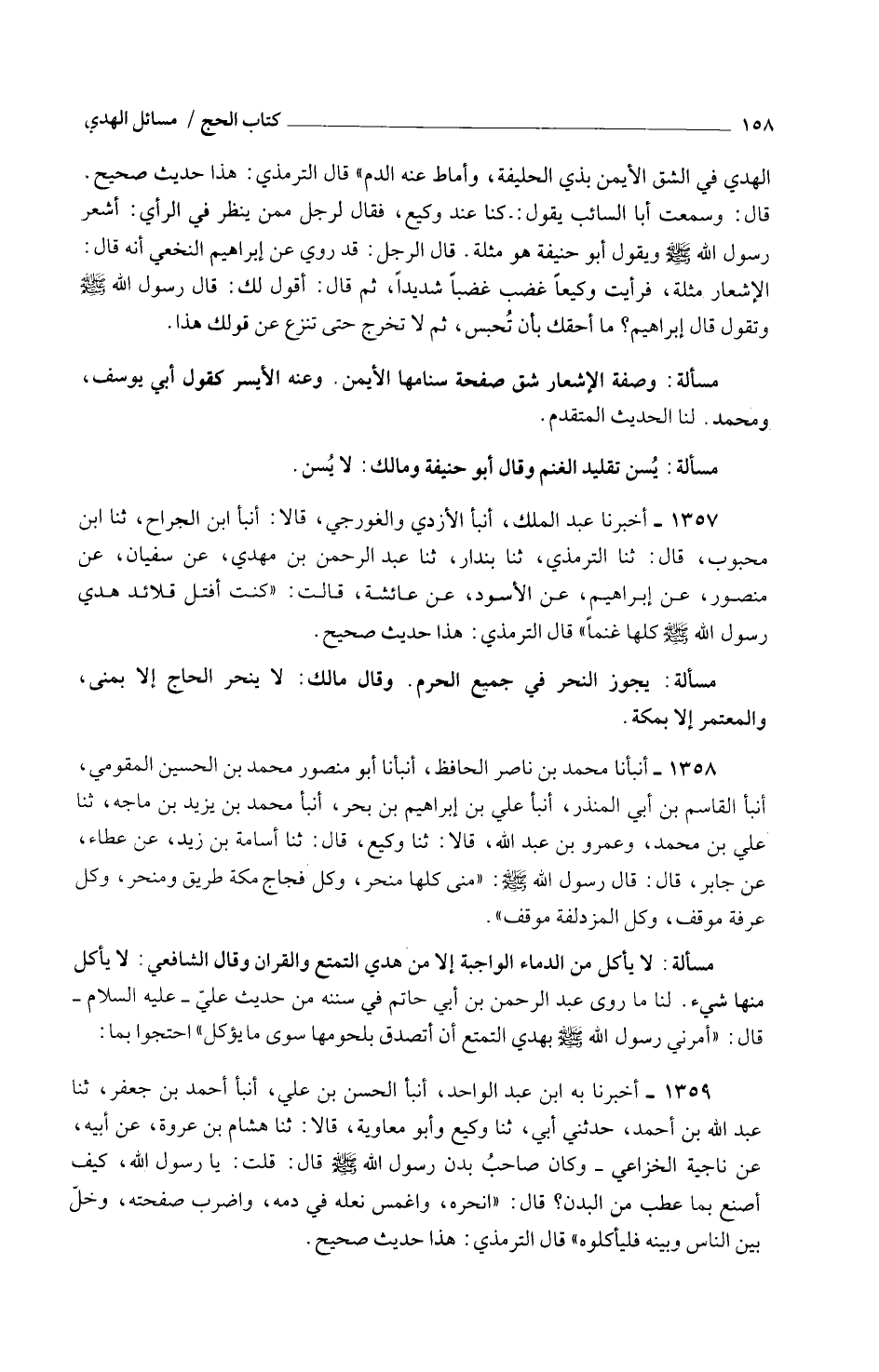 1357 - أَخْبَرَنَا عَبْدُ الْمَلِكِ أَنْبَأَ الْأَزْدِيُّ وَالْغُورَجِيُّ قَالَا أنبأ ابْن الْجراح ثَنَا ابْن مَحْبُوب قَالَ ثَنَا التِّرْمِذِيّ ثَنَا بنْدَار ثَنَا عَبْدُ الرَّحْمَنِ بْنُ مَهْدِيٍّ عَنْ سُفْيَانَ عَنْ مَنْصُورٍ عَنْ إِبْرَاهِيمَ عَنِ الْأَسْوَدِ عَنْ عَائِشَةَ قَالَتْ كُنْتُ أَفْتُلُ قَلَائِدَ هَدْيِ رَسُولِ اللَّهِ صَلَّى اللَّهُ عَلَيْهِ وَسَلَّمَ كُلَّهَا غَنَمًا قَالَ التِّرْمِذِيُّ هَذَا حَدِيثٌ صَحِيحٌ