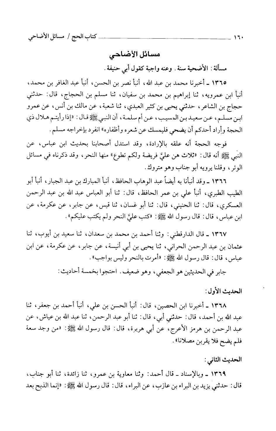 1367 - قَالَ الدَّارَقُطْنِيّ وثنا أَحْمَدُ بْنُ مُحَمَّدِ بْنِ سَعْدَانَ ثَنَا سعيد بن أَيُّوب ثَنَا عُثْمَانُ بْنُ عَبْدِ الرَّحْمَنِ الْحَرَّانِيُّ ثَنَا يَحْيَى بْنِ أَبِي أُنَيْسَةَ عَنْ جَابِرٍ عَنْ عِكْرَمَةَ عَنِ ابْنِ عَبَّاسٍ قَالَ قَالَ رَسُولُ اللَّهِ صَلَّى اللَّهُ عَلَيْهِ وَسَلَّمَ أُمِرْتُ بِالنَّحْرِ وَلَيْسَ بِوَاجِبٍ