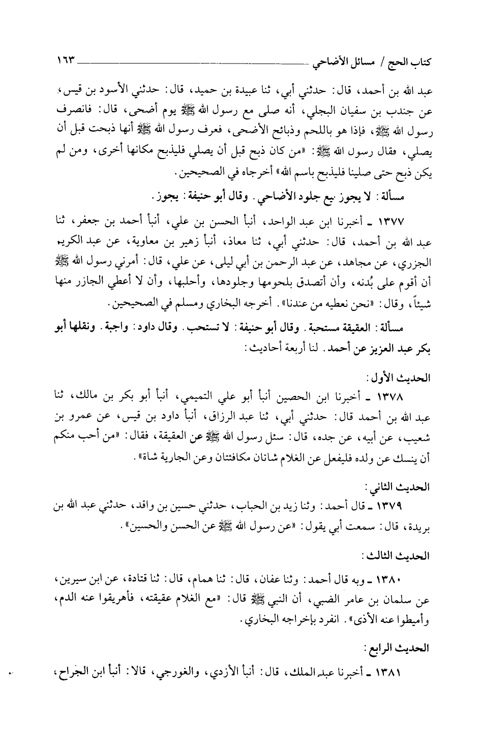 عَبْدُ اللَّهِ بْنُ أَحْمَدَ قَالَ حَدثنِي أبي ثَنَا عُبَيْدَةُ بْنُ حُمَيْدٍ قَالَ حَدَّثَنِي الْأَسْوَدُ بْنُ قَيْسٍ عَنْ جُنْدُبِ عَن سُفْيَانَ الْبَجَلِيِّ أَنَّهُ صَلَّى مَعَ رَسُولُ اللَّهِ صَلَّى اللَّهُ عَلَيْهِ وَسَلَّمَ يَوْمَ أَضْحَى قَالَ فَانْصَرَفَ رَسُولُ اللَّهِ صَلَّى اللَّهُ عَلَيْهِ وَسَلَّمَ فَإِذَا هُوَ بِاللَّحْمِ وَذَبَائِحِ الْأَضْحَى فَعَرِفَ رَسُولُ اللَّهِ صَلَّى اللَّهُ عَلَيْهِ وَسَلَّمَ أَنَّهَا ذُبِحَتْ قَبْلَ أَنْ يُصَلِّيَ فَقَالَ رَسُولُ اللَّهِ صَلَّى اللَّهُ عَلَيْهِ وَسَلَّمَ مَنْ كَانَ ذَبَحَ قَبْلَ أَنْ يُصَلِّيَ فَلْيَذْبَحْ مَكَانَهَا أُخْرَى وَمَنْ لَمْ يَكُنْ ذَبَحَ حَتَّى صَلَّيْنَا فَلْيَذْبَحْ بِاسْمِ اللَّهِ أَخْرَجَاهُ فِي الصَّحِيحَيْنِ
