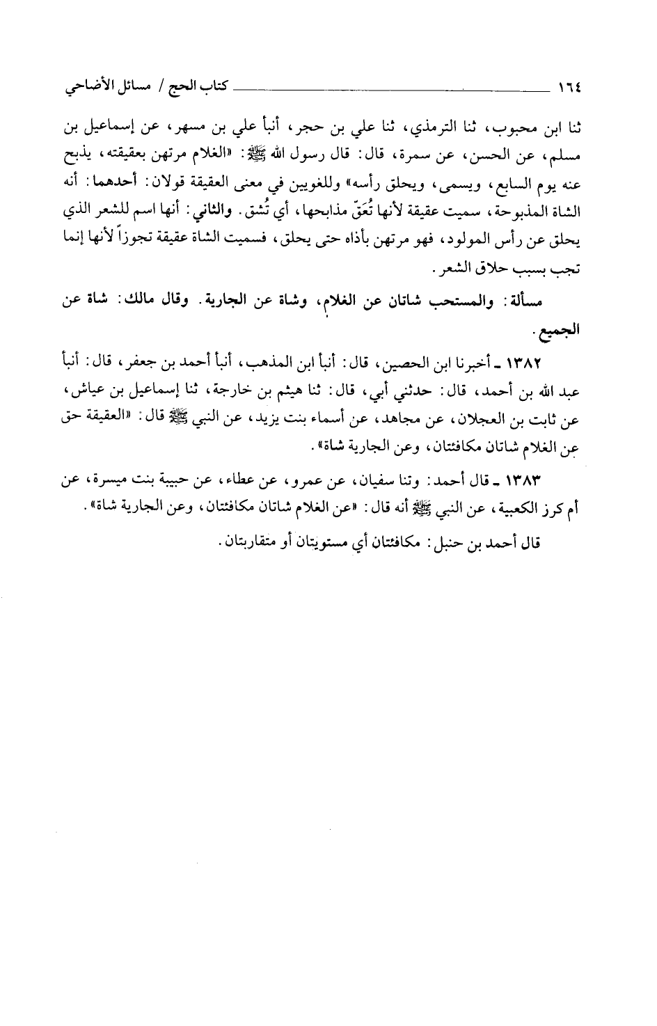 ثَنَا ابْن مَحْبُوب ثَنَا التِّرْمِذِيّ ثَنَا عَليّ بن حجر أنبأ عَلِيُّ بْنُ مُسْهِرٍ عَنْ إِسْمَاعِيلَ بْنِ مُسْلِمٍ عَنِ الْحَسَنِ عَنْ سَمُرَةَ قَالَ قَالَ رَسُولُ اللَّهِ صَلَّى اللَّهُ عَلَيْهِ وَسَلَّمَ الْغُلَامُ مُرْتَهَنٌ بِعَقِيقَتِهِ يُذْبَحُ عَنْهُ يَوْمَ السَّابِعِ وَيُسَمَّى وَيُحْلَقُ رَأْسُهُ وَلِلُّغَوِيِّينَ فِي مَعْنَى الْعَقِيقَةِ قَوْلَانِ أَحَدُهُمَا أَنَّهُ الشَّاةُ الْمَذْبُوحَةُ سُمِّيَتْ عَقيِقَةَ لِأَنَّهَا تُعَقُّ مَذَابِحُهَا أَيْ تُشَقُّ وَالثَّانِي أَنَّهَا اسْمٌ لِلشَّعْرِ الَّذِي يحلق على رَأْسِ الْمَوْلُودِ فُهُوَ مُرْتَهِنٌ بِأَذَاهِ حَتَّى يُحْلَقَ فَسُمِّيَتِ الشَّاةُ عَقِيقَةً تجوزا لِأَنَّهَا إِنَّمَا تجب بِسَبَبِ حِلَاقِ الشَّعْرِ