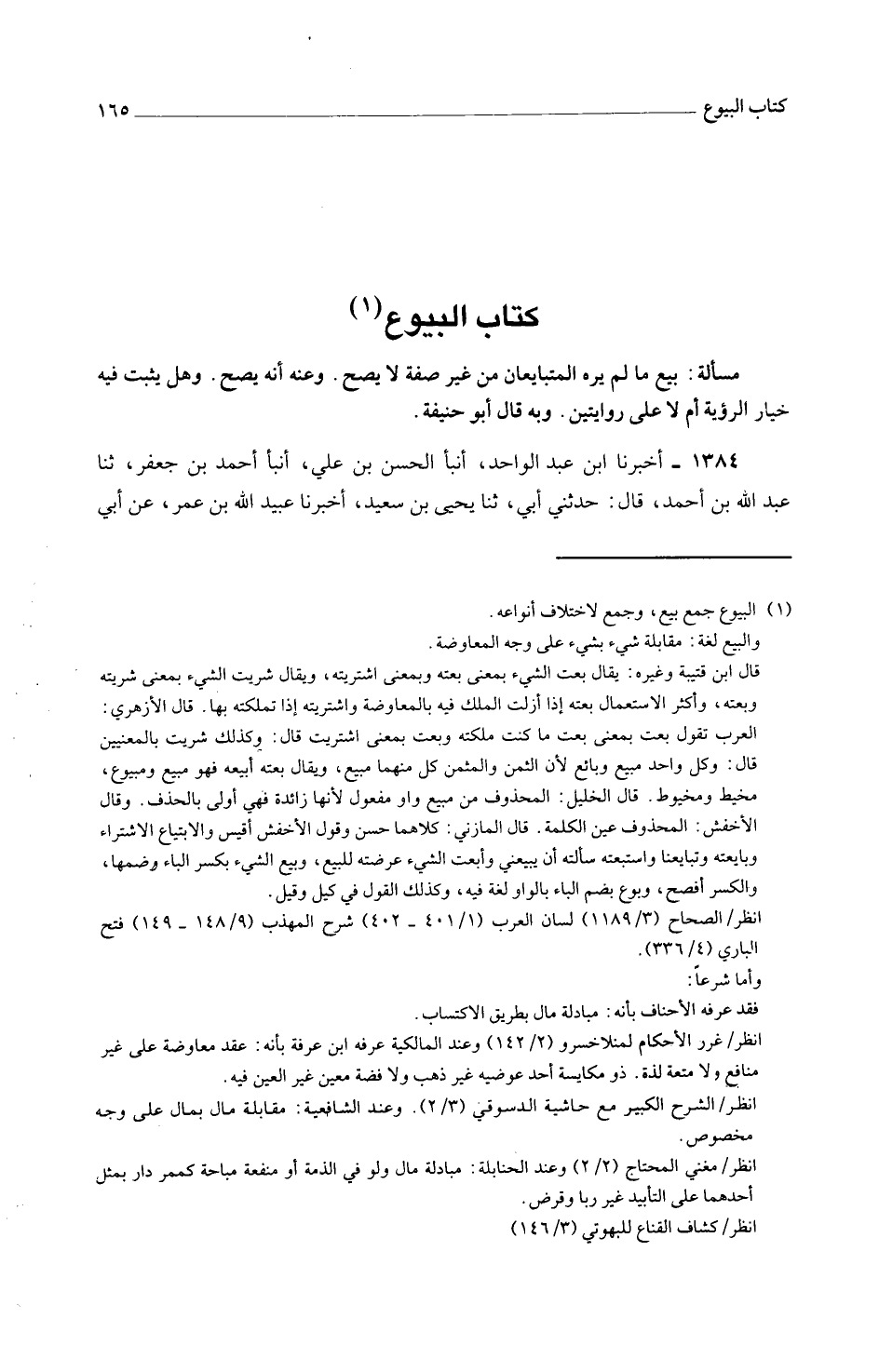 1384 - أَخْبَرَنَا ابْنُ عَبْدِ الْوَاحِدِ أَنْبَأَ الْحَسَنُ بْنُ عَلِيٍّ أنبأ أَحْمد بن جَعْفَر ثَنَا عَبْدُ اللَّهِ بْنُ أَحْمَدَ قَالَ حَدثنِي أبي ثَنَا يَحْيَى بْنُ سَعِيدٍ أَخْبَرَنَا عُبَيْدُ اللَّهِ بْنِ عُمَرَ عَنْ أَبِي