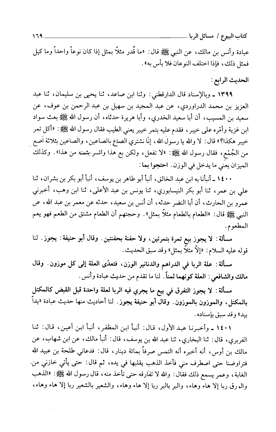 1399 - وَبِالْإِسْنَادِ قَالَ الدَّارَقُطْنِيّ وثنا ابْن صاعد ثَنَا يحيى بن سُلَيْمَان ثَنَا عَبْدُ الْعَزِيزِ بْنُ مُحَمَّدٍ الدَّرَاوَرْدِيُّ عَنْ عَبْدِ الْمَجِيدِ بْنِ سُهَيْلِ بْنِ عَبْدِ الرَّحْمَنِ بْنِ عَوْفٍ عَنْ سَعِيدِ بْنِ الْمُسَيِّبِ أَنَّ أَبَا سَعِيدٍ الْخُدْرِيَّ وَأَبَا هُرَيْرَةَ حَدَّثَاهُ أَنَّ رَسُولَ اللَّهِ صَلَّى اللَّهُ عَلَيْهِ وَسَلَّمَ بَعَثَ سَوَادَ ابْن غَزِيَّةَ وَأَمَرَهُ عَلَى خَيْبَرَ فَقَدِمَ عَلَيْهِ بِتَمْر خَيْبَر يَعْنِي الطبب فَقَالَ رَسُولُ اللَّهِ صَلَّى اللَّهُ عَلَيْهِ وَسَلَّمَ أَكُلُّ تَمْرِ خَيْبَرَ هَكَذَا قَالَ لَا وَاللَّهِ يَا رَسُولَ اللَّهِ إِنَّا نَشْتَرِي الصَّاعَ بِالصَّاعَيْنِ وَالصَّاعَيْنِ بِثَلَاثَةِ آصُعٍ مِنَ الْجَمْعِ فَقَالَ رَسُولُ اللَّهِ صَلَّى اللَّهُ عَلَيْهِ وَسَلَّمَ لَا تَفْعَلْ وَلَكِن بِعْ هَذَا وأشتر بِثَمَنِهِ مِنْ هَذَا وَكَذَلِكَ الْمِيزَانُ يَعْنِي مَا يَدْخُلُ فِي الْوَزْنِ احْتَجُّوا بِمَا