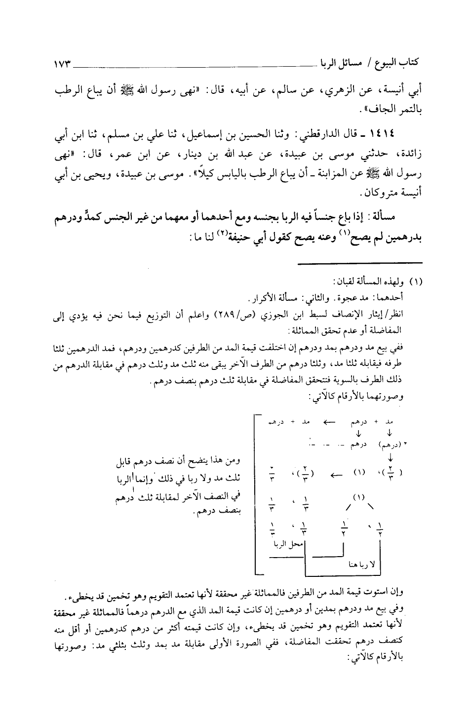 1414 - قَالَ الدَّارَقُطْنِيّ وثنا الْحُسَيْن بن إِسْمَاعِيل ثَنَا عَليّ بن مُسلم ثَنَا ابْنُ أَبِي زَائِدَةَ حَدَّثَنِي مُوسَى بْنِ عُبَيْدَةَ عَنْ عَبْدِ اللَّهِ بْنِ دِينَارٍ عَنْ ابْنِ عُمَرَ قَالَ نَهَى رَسُولُ اللَّهِ صَلَّى اللَّهُ عَلَيْهِ وَسَلَّمَ عَنِ الْمُزَابَنَةِ أَنْ يُبَاعَ الرُّطَبُ بِالْيَابِسِ كَيْلًا مُوسَى بْنُ عُبَيْدَةَ وَيَحْيَى بْنُ أَبِي أُنَيْسَةَ مَتْرُوكَانِ