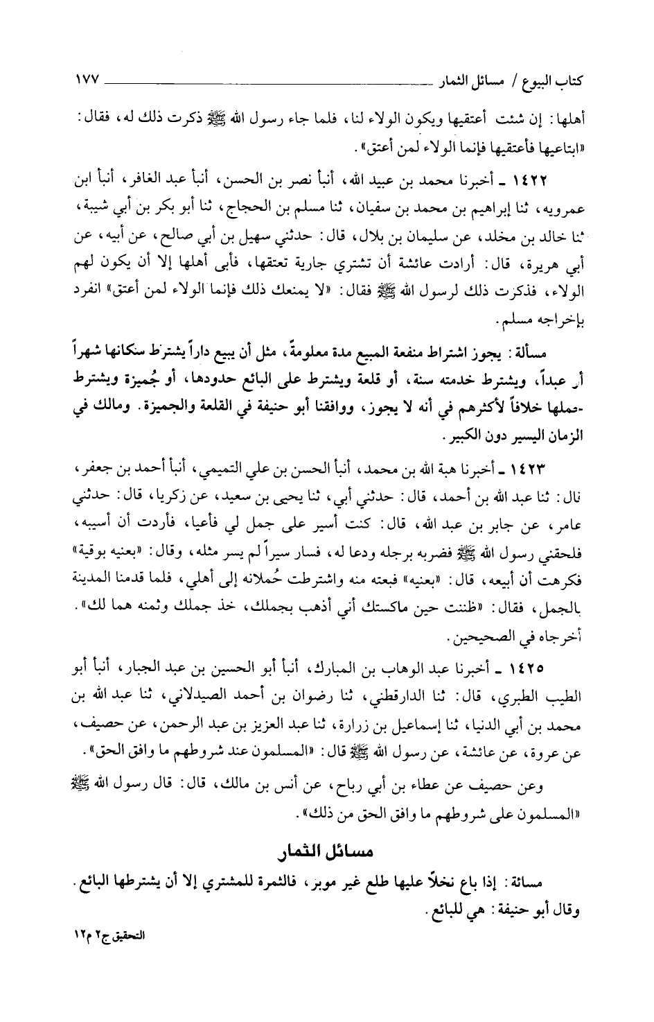 1425 - أَخْبَرَنَا عَبْدُ الْوَهَّابِ بْنُ الْمُبَارك أنبأ أَبُو الْحُسَيْنِ بْنِ عَبْدِ الْجَبَّارِ أَنْبَأَ أَبُو الطَّيِّبِ الطَّبَرِيُّ قَالَ ثَنَا الدَّارَقُطْنِيّ ثَنَا رضوَان بن أَحْمد الصيدلاني ثَنَا عَبْدُ اللَّهِ بْنُ مُحَمَّدِ بْنِ أبي الدُّنْيَا ثَنَا إِسْمَاعِيل بن زُرَارَة ثَنَا عَبْدُ الْعَزِيزِ بْنُ عَبْدِ الرَّحْمَنِ عَن حصيف عَنْ عُرْوَةَ عَنْ عَائِشَةَ عَنِ رَسُولُ اللَّهِ صَلَّى اللَّهُ عَلَيْهِ وَسَلَّمَ قَالَ الْمُسْلِمُونَ عِنْدَ شُرُوطِهِمْ مَا وَافق الْحق