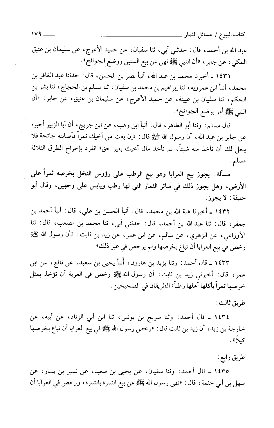 1435 - قَالَ أَحْمد وثنا سُفْيَانُ عَنْ يَحْيَى بْنِ سَعِيدٍ عَن نسير بْنِ يَسَارٍ عَنْ سُهْلِ بْنِ أَبِِي حَثْمَةَ قَالَ نَهَى رَسُولُ اللَّهِ صَلَّى اللَّهُ عَلَيْهِ وَسَلَّمَ عَن بيع الثَّمَرَة بالثمرة وَرَخَصَّ فِي الْعَرَايَا أَنْ
