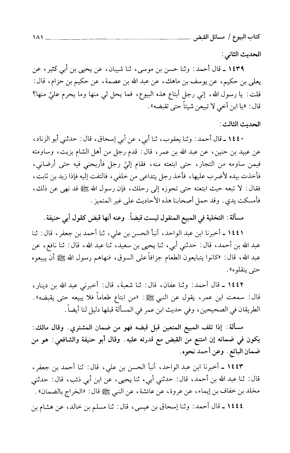 1439 - قَالَ أَحْمد وثنا حسن بن مُوسَى ثَنَا شَيْبَانُ عَنْ يَحْيَى بْنِ أَبِِي كَثِيرٍ عَنْ يَعْلَى بْنِ حَكِيمٍ عَنْ يُوسُفَ بْنِ مَاهِكٍ عَنْ عَبْدِ اللَّهِ بْنِ عَصْمَةَ عَنِ حَكِيمِ بْنِ حِزَامٍ قَالَ قُلْتُ يَا رَسُولَ اللَّهِ إِنِّي رَجُلٌ أَبْتَاعُ هَذِهِ الْبُيُوعَ فَمَا يَحِلُّ لِي مِنْهَا وَمَا يَحْرُمُ عَلَيَّ مِنْهَا قَالَ يَا ابْنَ أَخِي لَا تَبِيعَنَّ شَيْئًا حَتّى تَقْبِضَهُ