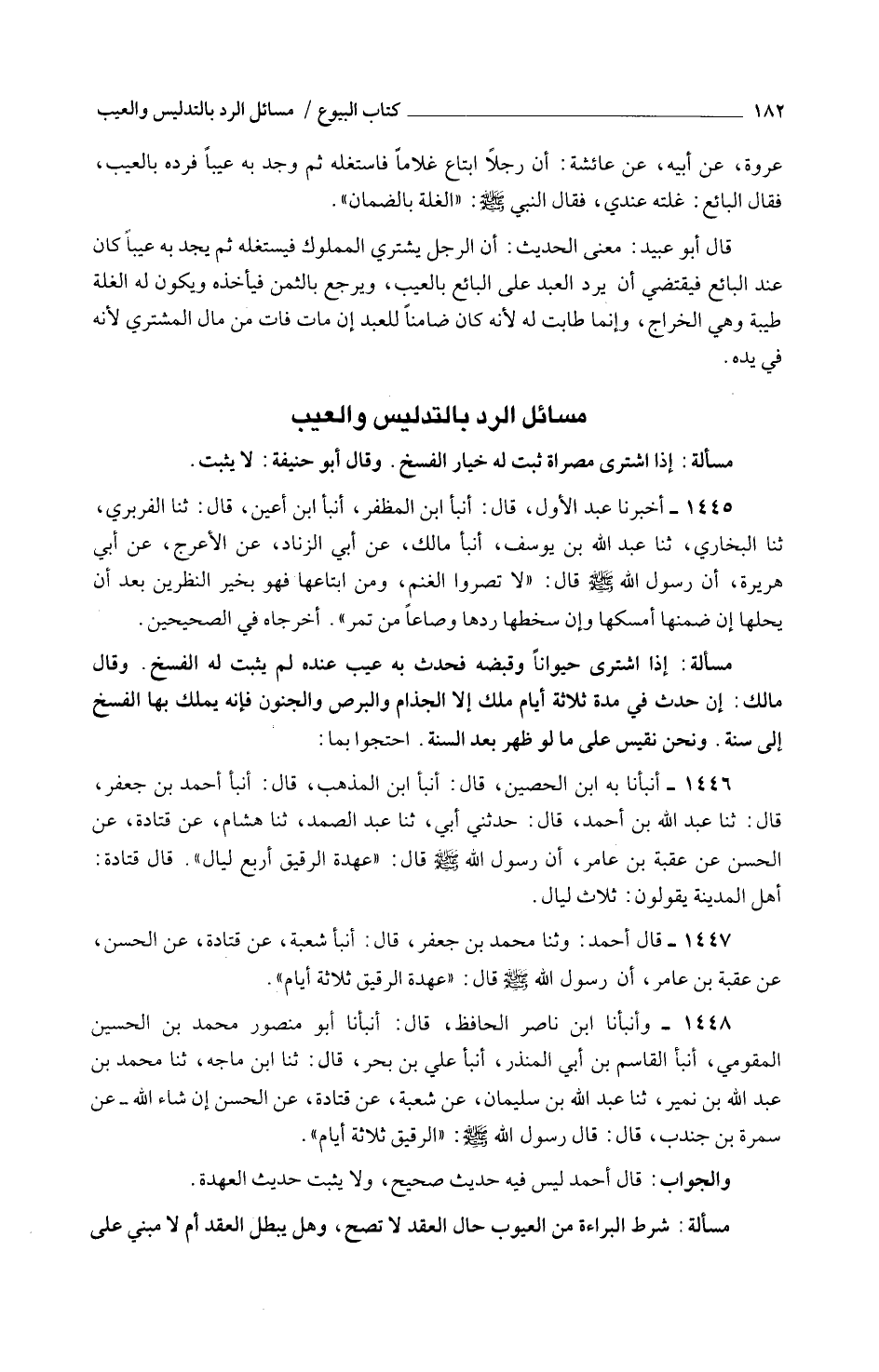 1446 - أَنْبَأَنَا بِهِ ابْنُ الْحُصَيْنِ قَالَ أَنْبَأَ ابْنُ الْمُذْهِبِ قَالَ أَنْبَأَ أَحْمَدُ بْنُ جَعْفَرٍ قَالَ ثَنَا عَبْدُ اللَّهِ بْنُ أَحْمَدَ قَالَ حَدثنِي أبي ثَنَا عبد الصَّمد ثَنَا هِشَامٍ عَنْ قَتَادَةَ عَنِ الْحَسَنِ بن عُقْبَةَ بْنِ عَامِرٍ أَنّ رَسُولَ اللَّهِ صَلَّى اللَّهُ عَلَيْهِ وَسَلَّمَ قَالَ عُهْدَة الرَّقِيق أَربع ليل قَالَ قَتَادَة أَهْلُ الْمَدِينَةِ يَقُولُونَ ثَلَاث لَيَال