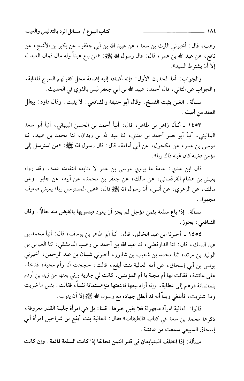1454 - أَخْبَرَنَا ابْنُ عَبْدِ الْخَالِقِ قَالَ أَنْبَأَ أَبُو طَاهِرِ بْنُ يُوسُفَ قَالَ أَنْبَأَ مُحَمَّدُ بْنُ عَبْدِ الْملك قَالَ ثَنَا الدَّارَقُطْنِيّ ثَنَا عَبْدُ اللَّهِ بْنُ أَحْمَدَ بْنِ وهيب الدِّمَشْقِي ثَنَا الْعَبَّاس بن الْوَلِيد بن مرْثَد ثَنَا مُحَمَّدُ بْنُ شُعَيْبِ بْنِ شَابُورٍ أَخْبَرَنِي شَيْبَانُ بْنُ عَبْدُ الرَّحْمَنِ أَخْبَرَنِي يُونُسُ بْنُ أَبِِي إِسْحَاقَ عَن أمه العاليه بنت أَيفع قَالَت حججْت أَنا وَأم مجية فَدَخَلْنَا عَلَى عَائِشَةَ فَقَالَتْ لَهَا أم مجبة يَا أُمَّ الْمُؤْمِنِينَ كَانَتْ لِي جَارِيَةٌ وَإِنِّي بِعْتُهَا مِنْ زَيْدِ بْنِ أَرْقَمَ بِثَمَانِمِائَةِ دِرْهَمٍ إِلَى عطاية وَإِنَّهُ أَرَادَ بَيْعَهَا فَابْتَعْتُهَا مِنْهُ بِسِتُّمِائَةٍ نَقْدًا فَقَالَتْ بِئْسَ مَا شَرَيْتِ وَمَا اشْتَرَيْتِ فَأَبْلِغِي زَيْدًا أَنَّهُ قَدْ أَبْطَلَ جِهَادَهُ مَعَ رَسُولُ اللَّهِ صَلَّى اللَّهُ عَلَيْهِ وَسَلَّمَ إِلَّا أَنْ يَتُوبَ
