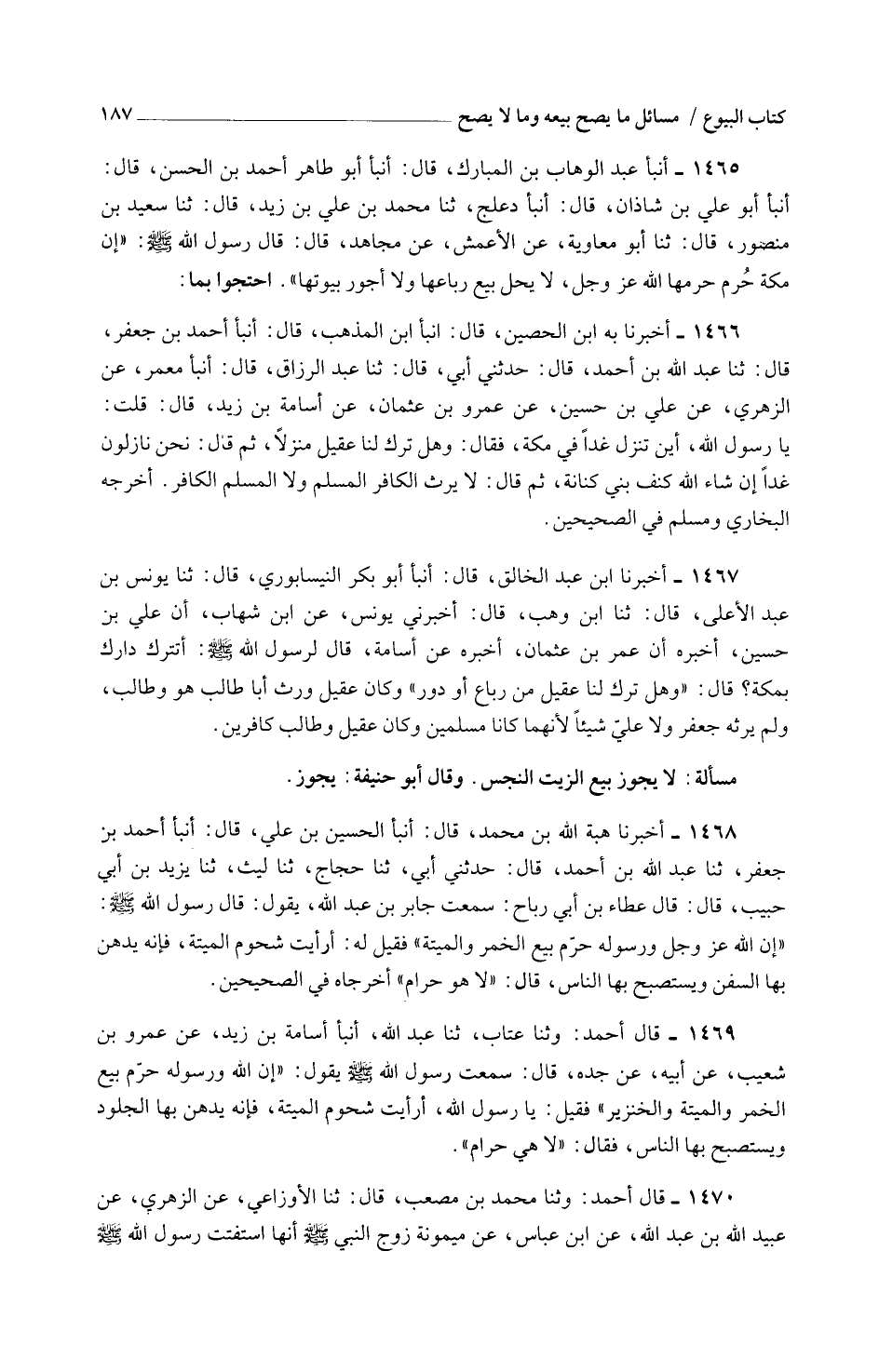 1467 - أَخْبَرَنَا ابْنُ عَبْدُ الْخَالِقِ قَالَ أنبأ أَبُو بكر النَّيْسَابُورِي قَالَ ثَنَا يُونُسُ بْنُ عَبْدِ الْأَعْلَى قَالَ ثَنَا ابْنُ وَهْبٍ قَالَ أَخْبَرَنِي يُونُسُ عَنِ ابْنِ شِهَابٍ أَنَّ عَلِيَّ بن حُسَيْن أخبرهُ أَن عمر بْنَ عُثْمَانَ أَخْبَرَهُ عَنْ أُسَامَةَ قَالَ لِرَسُولِ اللَّهِ صَلَّى اللَّهُ عَلَيْهِ وَسلم أتترك دَارَكَ بِمَكَّةَ قَالَ وَهَلْ تَرَكَ لَنَا عَقِيلٌ مِنْ رِبَاعٍ أَوْ دُورٍ وَكَانَ عَقِيلُ وَرِثَ أَبَا طَالِبٍ هُوَ وَطَالِبٌ وَلَمْ يَرِثْهُ جَعْفَرٌ وَلَا عَلِيٌّ شَيْئًا لِأَنَّهُمَا كَانَا مُسْلِمَيْنِ وَكَانَ عَقِيلٌ وَطَالِبٌ كَافِرَيْنِ