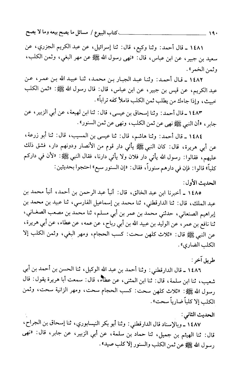 1487 - وَبِالْإِسْنَادِ قَالَ الدَّارَقُطْنِيّ وثنا أَبُو بكر النَّيْسَابُورِي ثَنَا إِسْحَاق بن الْجراح قَالَ ثَنَا الْهَيْثَم بن جميل ثَنَا حَمَّادُ بْنُ سَلَمَةَ عَنْ أَبِِي الزُّبَيْرِ عَنْ جَابِرٍ قَالَ نَهَى رَسُولُ اللَّهِ صَلَّى اللَّهُ عَلَيْهِ وَسَلَّمَ عَنْ ثَمَنِ الْكَلْبِ وَالسِّنَّوْرِ إِلَّا كلب الصَّيْد