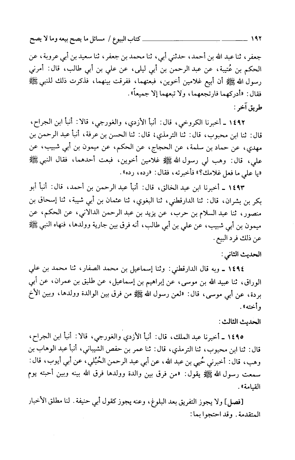 1493 - أَخْبَرَنَا ابْنُ عَبْدِ الْخَالِقِ قَالَ أَنْبَأَ عَبْدُ الرَّحْمَنِ بْنُ أَحْمَدَ قَالَ أَنْبَأَ أَبُو بكر بن بَشرَان قَالَ ثَنَا الدَّارَقُطْنِيّ ثَنَا الْبَغَوِيّ ثَنَا عُثْمَان بن أبي شيبَة ثَنَا إِسْحَاق بن مَنْصُور ثَنَا عَبْدُ السَّلَامِ بْنُ حَرْبٍ عَنْ يَزِيدَ بْنِ عَبْدِ الرَّحْمَنِ الدِّالَانِيِّ عَنِ الْحَكَمِ عَنْ مَيْمُونِ بْنِ أبي شيبا عَنْ عَلِيِّ بْنِ أَبِي طَالِبٍ أَنَّهُ فَرَّقَ بَيْنَ جَارِيَةٍ وَوَلَدِهَا فَنَهَاهُ النَّبِيُّ صَلَّى اللَّهُ عَلَيْهِ وَسَلَّمَ عَنْ ذَلِكَ فَرَدَّ الْبَيْعَ