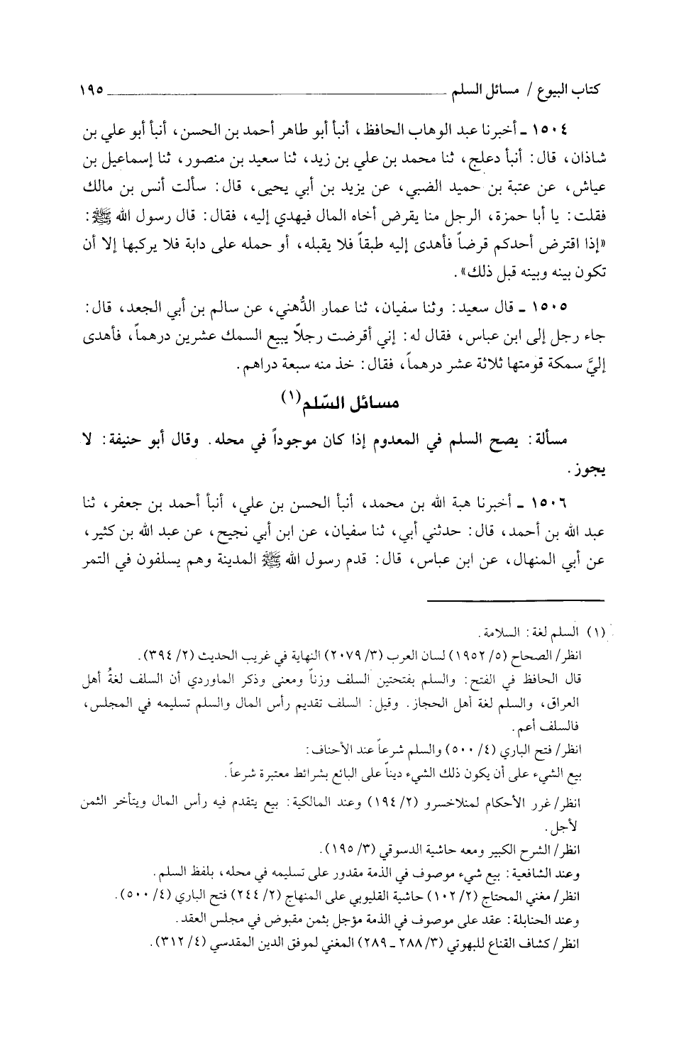 1506 - أَخْبَرَنَا هِبَةُ اللَّهِ بْنُ مُحَمَّدٍ أَنْبَأَ الْحَسَنُ بْنُ عَلِيٍّ أَنْبَأَ أَحْمد بن جَعْفَر ثَنَا عَبْدُ اللَّهِ بْنُ أَحْمَدَ قَالَ حَدثنِي أبي ثَنَا سُفْيَانُ عَنِ ابْنِ أَبِِي نُجَيْحٍ عَنْ عَبْدِ اللَّهِ بْنِ كَثِيرٍ عَنْ أَبِِي الْمِنْهَالِ عَنِ ابْنِ عَبَّاسٍ قَالَ قَدِمَ رَسُولُ اللَّهِ صَلَّى اللَّهُ عَلَيْهِ وَسَلَّمَ الْمَدِينَةُ وهم يسلفون فِي التَّمْر