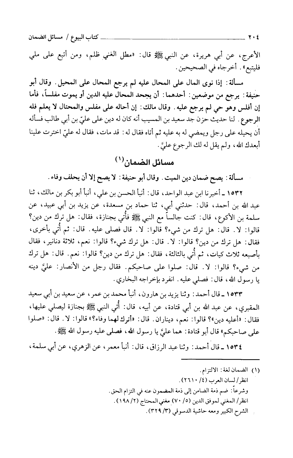 1532 - أَخْبَرَنَا ابْنُ عَبْدِ الْوَاحِدِ قَالَ أَنْبَأَ الْحَسَنُ بْنُ عَلِيٍّ أَنْبَأَ أَبُو بَكْرِ بْنُ مَالِكٍ ثَنَا عَبْدُ اللَّهِ بْنُ أَحْمَدَ قَالَ حَدثنِي أبي ثَنَا حَمَّادُ بْنُ مِسْعِدَةَ عَنْ يَزِيدَ بْنِ أَبِي عُبَيْدٍ عَنْ سَلَمَةَ بْنِ الْأَكْوَعِ قَالَ كُنْتُ جَالِسًا مَعَ النَّبِيِّ صَلَّى اللَّهُ عَلَيْهِ وَسَلَّمَ فَأُتِيَ بِجِنَازَةٍ فَقَالَ هَلْ تَرَكَ مِنْ دَيْنٍ قَالُوا لَا قَالَ هَلْ تَرَكَ مِنْ شَيْءٍ قَالُوا لَا قَالَ فَصَلَّى عَلَيْهِ قَالَ ثُمَّ أُتِيَ بِأُخْرَى فَقَالَ هَلْ تَرَكَ مِنْ دَيْنٍ قَالُوا لَا قَالَ هَل ترك شَيْءٍ قَالُوا نَعَمْ ثَلَاثَةَ دَنَانِيرَ فَقَالَ بِأُصْبُعِهِ ثَلَاثَ كَيَّاتٍ ثُمَّ أُتِيَ بِالثَّالِثَةِ فَقَالَ هَلْ تَرَكَ مِنْ دَيْنٍ قَالُوا نَعَمْ قَالَ هَلْ تَرَكَ مِنْ شَيْءٍ قَالُوا لَا قَالَ صَلُّوا عَلَى صَاحِبِكُمْ فَقَالَ رَجُلٌ مِنَ الْأَنْصَارِ عَلَيَّ دَيْنُهُ يَا رَسُول الله فَصَلَّى عَلَيْهِ انْفَرَدَ بِإِخْرَاجِهِ الْبُخَارِيُّ