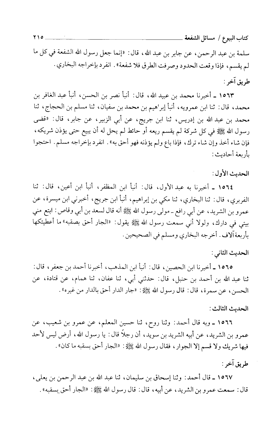 1562 - قَالَ أَحْمد وثنا إِسْحَاق بن سُلَيْمَان ثَنَا عَبْدِ اللَّهِ بْنِ عَبْدِ الرَّحْمَنِ بْنِ يَعْلَى قَالَ سَمِعْتُ عَمْرَو بْنَ الشَّرِيدِ عَنْ أَبِيهِ قَالَ قَالَ رَسُولُ اللَّهِ صَلَّى اللَّهُ عَلَيْهِ وَسلم الْجَار أَحَق بسقبه