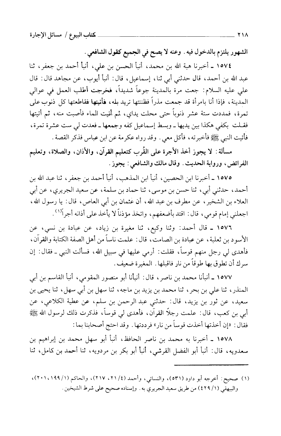 1577 - أَنْبَأنَا مُحَمَّدُ بْنُ نَاصِرٍ قَالَ أَنْبَأَنَا أَبُو مَنْصُورٍ الْمَقُومِيُّ أَنْبَأَ الْقَاسِمُ بْنُ أَبِي الْمُنْذر ثَنَا عَليّ بن بَحر ثَنَا مُحَمَّدُ بْنُ يَزِيدَ بْنِ مَاجَهْ ثَنَا سهل بن أبي سهل ثَنَا يَحْيَى بْنُ سَعِيدٍ عَنْ ثَوْرِ بْنِ يَزِيدَ قَالَ حدَّثَنِي عَبْدُ الرَّحْمَنِ بْنُ سَلْمٍ عَنْ عَطِيَّةَ الْكَلَاعِيِّ عَنْ أُبَيِّ بْنِ كَعْبٍ قَالَ عَلَّمْتُ رَجُلًا الْقُرْآنَ فَأَهْدَى لِي قَوْسًا فَذَكَرْتُ ذَلِكَ لِرَسُولِ اللَّهِ صَلَّى اللَّهُ عَلَيْهِ وَسَلَّمَ فَقَالَ إِنْ أَخَذْتَهَا أَخَذْتَ قَوْسًا مِنْ نَارٍ فَرَدَدْتُهَا وَقَدِ احْتَجَّ أَصْحَابُنَا بِمَا