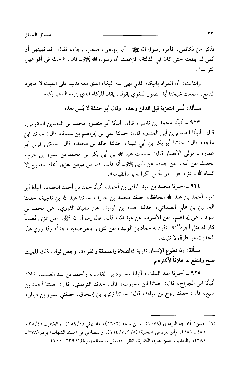 923 - أَنْبَأَنَا مُحَمَّدُ بْنُ نَاصِرٍ قَالَ أَنْبَأَنَا أَبُو مَنْصُورٍ مُحَمَّدُ بْنُ الْحُسَيْنِ الْمُقَوِّمِيُّ قَالَ أَنْبَأَنَا الْقَاسِمُ بْنُ أَبِي الْمُنْذِرِ قَالَ حَدَّثَنَا عَلِيُّ بْنُ إِبْرَاهِيمَ بْنِ سَلَمَةَ قَالَ حَدَّثَنَا ابْنُ مَاجَهْ قَالَ حَدَّثَنَا أَبُو بَكْرِ بْنُ أَبِي شَيْبَةَ حَدَّثَنَا خَالِدُ بْنُ مَخْلَدٍ قَالَ حَدَّثَنِي قَيْسٌ أَبُو عُمَارَةَ مَوْلَى الْأَنْصَارِ قَالَ سَمِعْتُ عَبْدُ اللَّهِ بْنُ أَبِي بَكْرٍ بْنِ مُحَمَّدِ بْنِ عَمْرِو بْنِ حَزْمٍ يُحَدِّثُ عَنْ أَبِيهِ عَنْ جَدِّهِ عَنِ النَّبِيِّ صَلَّى اللَّهُ عَلَيْهِ وَسَلَّمَ أَنَّهُ قَالَ مَا من مُؤمن يعزي أَخَاهُ بمصيبة إِلَّا كَسَاهُ اللَّهُ عَزَّ وَجَلَّ مِنْ حُلَلِ الْكَرَامَةِ يَوْمَ الْقِيَامَةِ