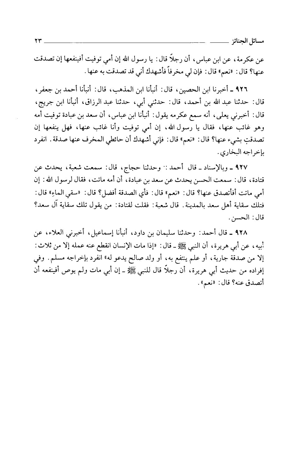 926 - أَخْبَرَنَا ابْنُ الْحُصَيْنِ قَالَ أَنْبَأَنَا ابْنُ الْمُذْهِبِ قَالَ أَنْبَأَنَا أَحْمَدُ بْنُ جَعْفَرٍ قَالَ حَدَّثَنَا عَبْدُ اللَّهِ بْنُ أَحْمَدَ قَالَ حَدَّثَنِي أَبِي حَدَّثَنَا عَبْدُ الرَّزَّاقِ أَنْبَأَنَا ابْن جريح قَالَ أَخْبَرَنِي يَعْلَى أَنَّهُ سَمِعَ عِكْرِمَةَ يَقُولُ أَنْبَأَنَا ابْنُ عَبَّاسٍ أَنَّ سَعْدَ بْنَ عُبَادَةَ تُوُفِّيَتْ أمه وهُوَ غَائِبٌ عَنْهَا فَقَالَ يَا رَسُولَ الله إِن أُمِّي توفيت وأَنا غَائِبٌ عَنْهَا فَهَلْ يَنْفَعُهَا إِنْ تَصَدَّقْتُ بِشَيْءٍ عَنْهَا قَالَ نَعَمْ قَالَ فَإِنِّي أُشْهِدُكَ أَنَّ حَائِطِي الْمَخْرَفَ عَنْهَا صَدَقَةٌ انْفَرَدَ بِإِخْرَاجِهِ الْبُخَارِيُّ