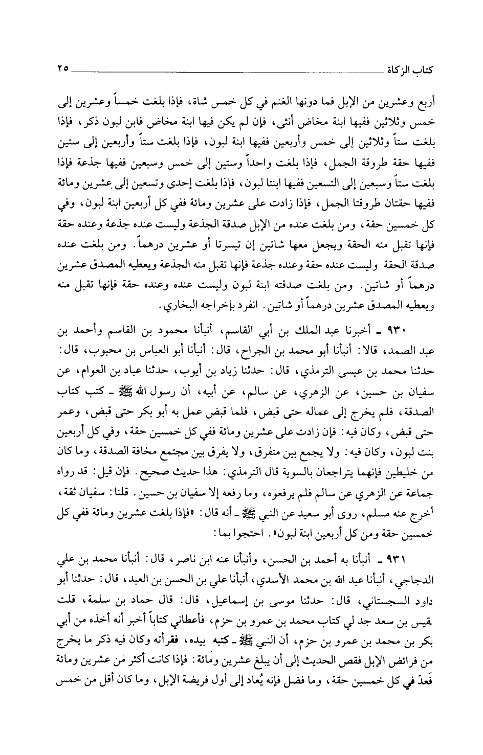 931 - أَنْبَأَنَا بِهِ أَحْمَدُ بْنُ الْحسن وأَنبأَنَا عَنْهُ ابْنُ نَاصِرٍ قَالَ أَنْبَأَنَا مُحَمَّدُ بْنُ عَلِيٍّ الدَّجَاجِيُّ أَنْبَأَنَا عَبْدُ اللَّهِ بْنُ مُحَمَّدٍ الْأَسْدِيُّ أَنْبَأَنَا عَلِيُّ بْنُ الْحَسَنِ بْنِ الْعَبْدِ قَالَ حَدَّثَنَا أَبُو دَاوُدَ السِّجِسْتَانِيُّ قَالَ حَدَّثَنَا مُوسَى بْنُ إِسْمَاعِيلَ قَالَ قَالَ حَمَّادُ بْنُ سَلمَة قلت قيس بن سعد جد لِي كِتَابَ مُحَمَّدِ بْنِ عَمْرِو بْنِ حَزْمٍ فَأْعَطانِي كِتَابًا أَخْبَرَ أَنَّهُ أَخَذَهُ مِنْ أَبِي بَكْرِ بْنِ مُحَمَّدِ بْنِ عَمْرِو بْنِ حَزْمٍ أَنَّ النَّبِيَّ صَلَّى اللَّهُ عَلَيْهِ وَسلم كتبه بِيَدِهِ فَقَرَأْتُهُ وَكَانَ فِيهِ ذِكْرُ مَا يُخْرَجُ مِنْ فَرَائِضِ الْإِبِلِ فَقَصَّ الْحَدِيثَ إِلَى أَنْ يَبْلُغَ عِشْرِينَ وَمِائَةً فَإِذَا كَانَتْ أَكْثَرَ مِنْ عِشْرِينَ وَمِائَةٍ فَعَدَّ فِي كُلِّ خمسين حقة ومَا فَضُلَ فَإِنَّهُ يُعَادُ إِلَى أَوَّلِ فَرِيضَة الْإِبِل ومَا كَانَ أقل من خمس