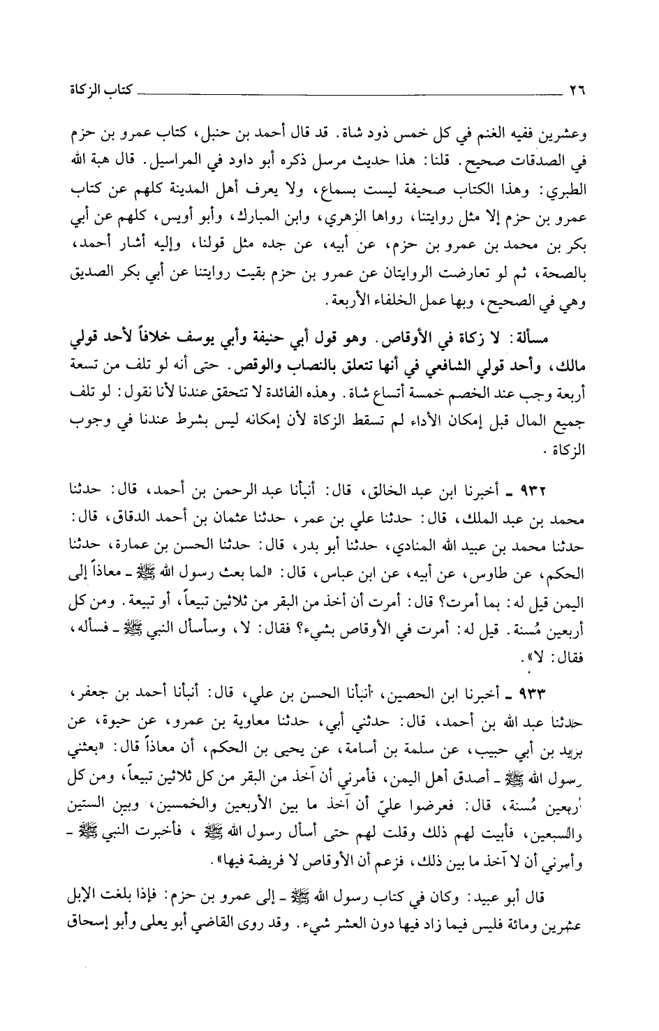 وعشْرين فَفِيهِ الْغَنَمُ فِي كُلِّ خَمْسِ ذود شَاة قَدْ قَالَ أَحْمَدُ بْنُ حَنْبَلٍ كِتَابُ عَمْرِو بْنِ حَزْمٍ فِي الصَّدَقَاتِ صَحِيحٌ قُلْنَا هَذَا حَدِيثٌ مُرْسَلٌ ذَكَرَهُ أَبُو دَاوُدَ فِي الْمَرَاسِيلِ قَالَ هِبَةُ اللَّهِ الطَّبَرِيُّ وَهَذَا الْكِتَابُ صَحِيفَةٌ لَيْسَتْ بِسَمَاعٍ وَلَا يَعْرِفُ أَهْلِ الْمَدِينَةِ كُلُّهُمْ عَنْ كِتَابِ عَمْرِو بْنِ حَزْمٍ إِلَّا مِثْلَ رِوَايَتِنَا رَوَاهَا الزُّهْرِيُّ وَابْن الْمُبَارك وأَبُو أُوَيْسٍ كُلُّهُمْ عَنْ أَبِي بَكْرِ بْنِ مُحَمَّدِ بْنِ عَمْرِو بْنِ حَزْمٍ عَنْ أَبِيهِ عَنْ جَدِّهِ مثل قَوْلنَا وإِلَيْهِ أَشَارَ أَحْمَدُ بِالصَّحَّةِ ثُمَّ لَوْ تَعَارَضَتِ الرِّوَايَتَانِ عَنْ عَمْرِو بْنِ حَزْمٍ بَقِيَتْ رِوَايَتُنَا عَنْ أَبِي بكر الصّديق وهِيَ فِي الصَّحِيحِ وَبَهَا عَمِلَ الْخُلَفَاءُ الْأَرْبَعَةُ