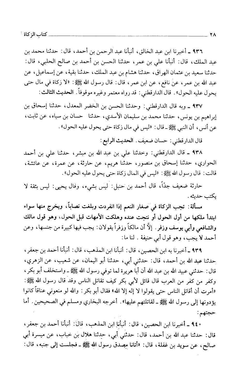 938 - قَالَ الدَّارَقُطْنِيّ وحَدَّثَنَا عَلِيُّ بْنُ عَبْدِ اللَّهِ بْنِ مُبَشِّرٍ حَدَّثَنَا عَلِيُّ بْنُ أَحْمَدَ الْحَوَارِيُّ حَدَّثَنَا إِسْحَاقُ بْنُ مَنْصُورٍ حَدَّثَنَا هُرَيْمٌ عَنْ حَارِثَةَ عَنْ عَمْرَةَ عَنْ عَائِشَةَ قَالَتْ قَالَ رَسُولُ اللَّهِ صَلَّى اللَّهُ عَلَيْهِ وَسَلَّمَ لَيْسَ فِي الْمَالِ زَكَاةٌ حَتَّى يَحُولَ عَلَيْهِ الْحَوْلُ