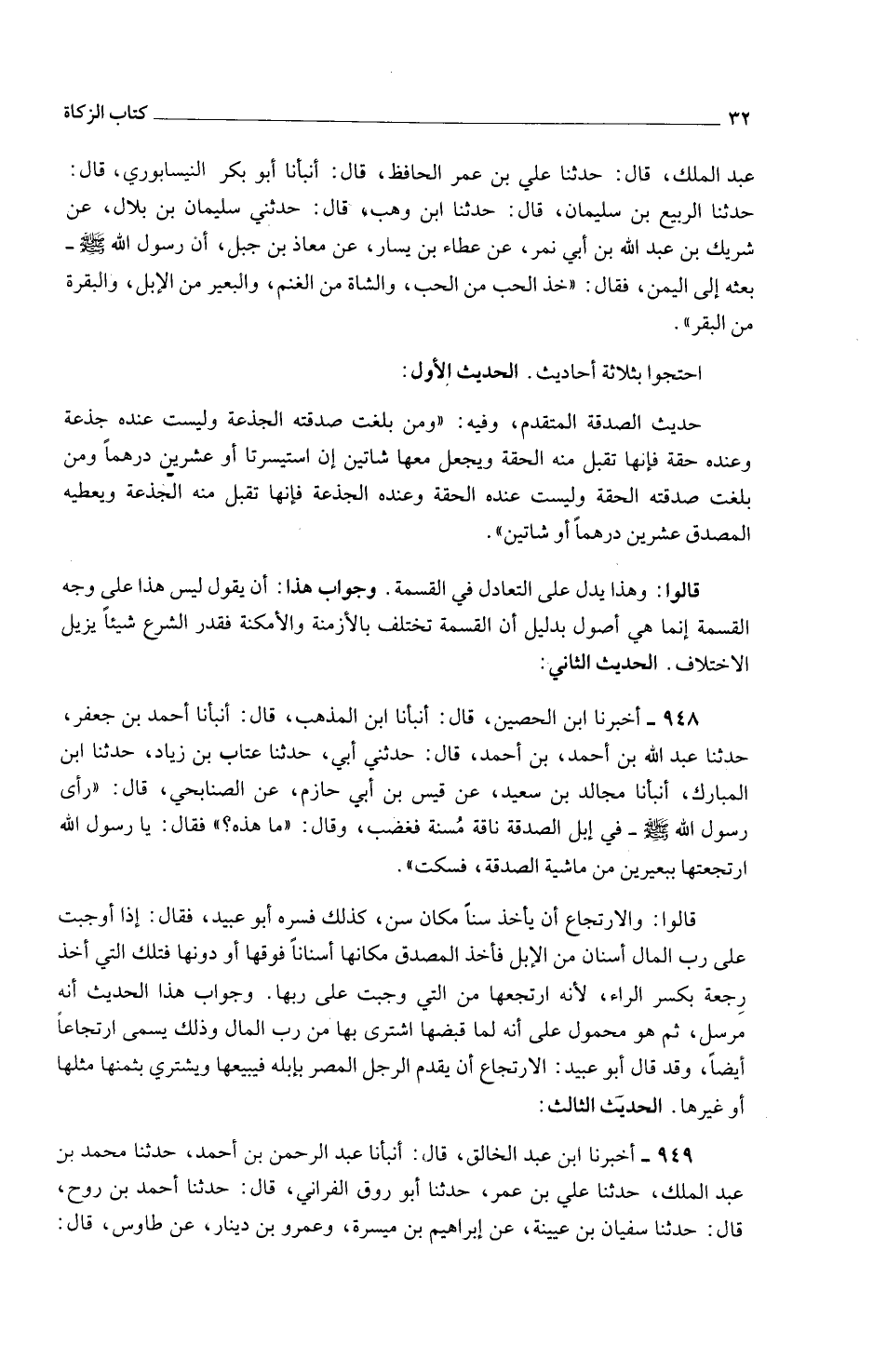 عَبْدِ الْمَلِكِ قَالَ حَدَّثَنَا عَلِيُّ بن عمر الْحَافِظ قَالَ أَنْبَأَنَا أَبُو بَكْرٍ النَّيْسَابُورِيُّ قَالَ حَدَّثَنَا الرَّبِيعُ بْنُ سُلَيْمَانَ قَالَ حَدَّثَنَا ابْنُ وَهْبٍ قَالَ حَدَّثَنِي سُلَيْمَانُ بْنُ بِلَالٍ عَنْ شَرِيكِ بْنِ عَبْدِ اللَّهِ بْنِ أَبِي نَمِرٍ عَنْ عَطَاءِ بْنِ يَسَارٍ عَنْ مُعَاذِ بْنِ جَبَلٍ أَنّ رَسُولَ اللَّهِ صَلَّى اللَّهُ عَلَيْهِ وَسَلَّمَ بَعَثَهُ إِلَى الْيَمَنِ فَقَالَ خُذِ الْحَبَّ مِنَ الْحَبِّ وَالشَّاةَ مِنَ الْغَنَمِ وَالْبَعِيرَ مِنَ الْإِبِل وَالْبَقَرَة مِنَ الْبَقَرِ