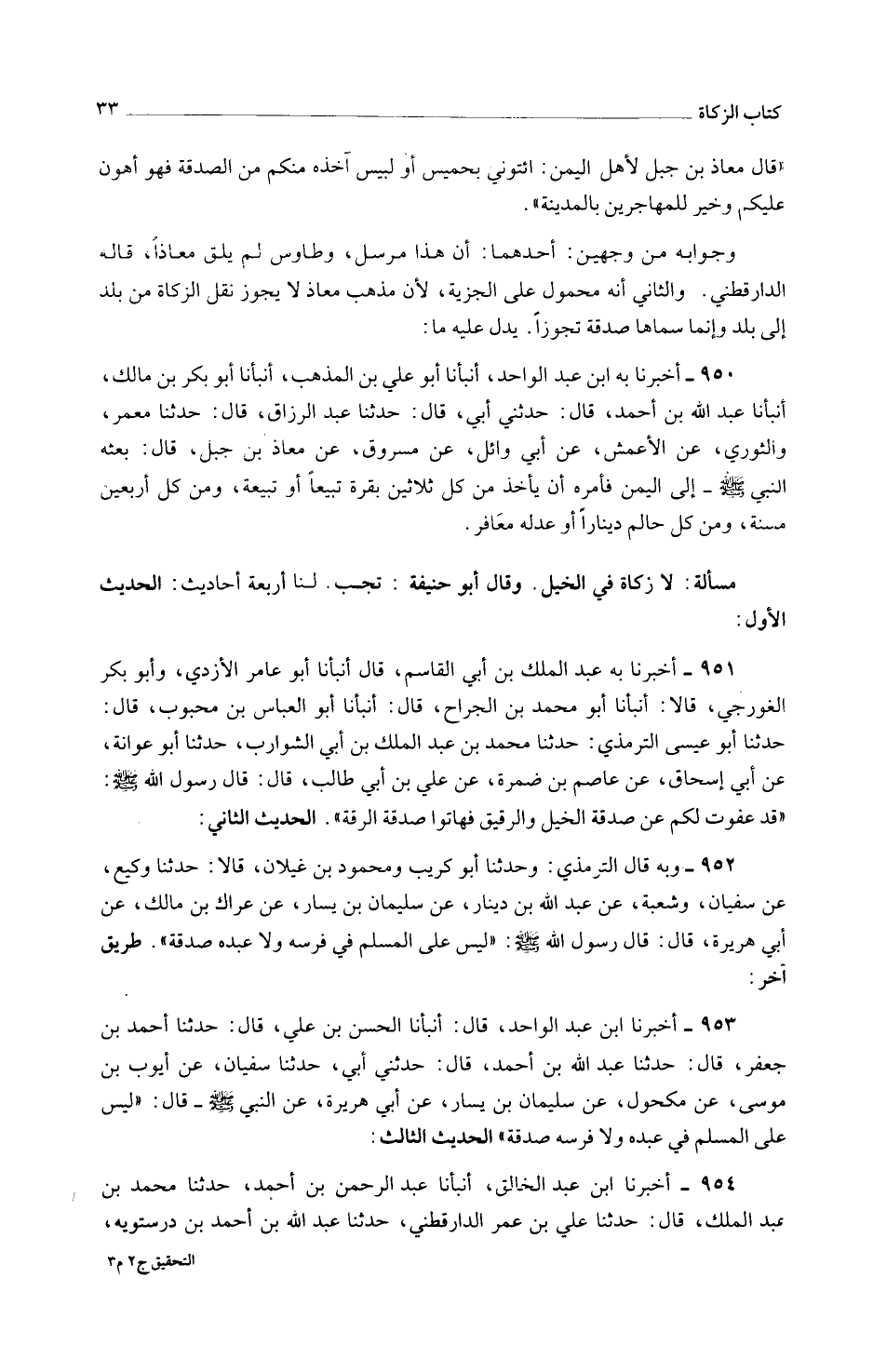 مَسْأَلَةٌ لَا زَكَاةَ فِي الْخَيْلِ وَقَالَ أَبُو حَنِيفَةَ تَجِبُ لَنَا أَرْبَعَةُ أَحَادِيثَ الْحَدِيثُ الْأَوَّلُ