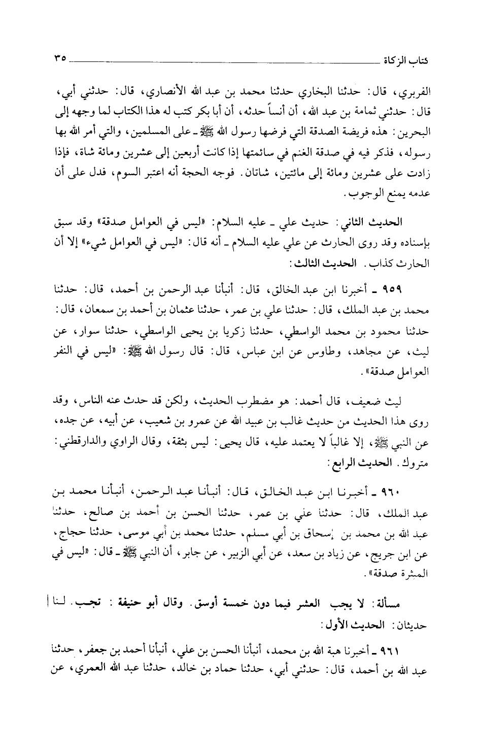 الْحَدِيثُ الثَّانِي حَدِيثُ عَلِيٍّ عَلَيْهِ السَّلَامُ لَيْسَ فِي الْعَوَامِلِ صَدَقَة وَقَدْ سَبَقَ بِإِسْنَادِهِ وَقَدْ رَوَى الْحَارِثُ عَنْ عَلِيٍّ عَلَيْهِ السَّلَامُ أَنَّهُ قَالَ لَيْسَ فِي الْعَوَامِلِ شَيْءٌ إِلَّا أَنَّ الْحَارِثَ كَذَّابٌ الْحَدِيثُ الثَّالِثُ