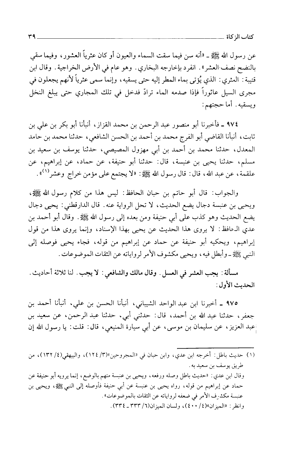 وَالْجَوَابُ قَالَ أَبُو حَاتِمِ بن حبَان الْحَافِظ لَيْسَ هَذ 1 مِنْ كَلَامِ رَسُولِ اللَّهِ صَلَّى الله عَلَيْهِ وسلم وَيَحْيَى بْنُ عَنْبَسَةَ دَجَّالٌ يَضَعُ الْحَدِيثَ لَا تَحِلُّ الرِّوَايَةُ عَنْهُ قَالَ الدَّارَقُطْنِيُّ يَحْيَى دَجَّالٌ يَضَعُ الْحَدِيثَ وهُوَ كَذَبَ عَلَى أَبِي حَنِيفَةَ وَمِنْ بَعْدِهِ إِلَى رَسُولِ اللَّهِ صَلَّى اللَّهُ عَلَيْهِ وَسَلَّمَ وَقَالَ أَبُو أَحْمَدَ بْنُ عَدِيٍّ الْحَافِظُ لَا يرْوى هَذَا الحَدِيث عَن يحيى بِهَذَا الْإِسْنَاد وإِنَّمَا يُرْوَى هَذَا مِنْ قَوْلِ إِبْرَاهِيمَ وَيَحْكِيهِ أَبُو حَنِيفَةَ عَنْ حَمَّادٍ عَنْ إِبْرَاهِيمَ مِنْ قَوْلِهِ فَجَاءَ يَحْيَى فَوَصَلَهُ إِلَى النَّبِيِّ صَلَّى الله عَلَيْهِ وَسلم وَأَبْطَلَ فِيهِ وَيَحْيَى مَكْشُوفُ الْأَمْرِ لِرَوَايَاتِهِ عَنِ الثِّقَاتِ الْمَوْضُوعَاتِ