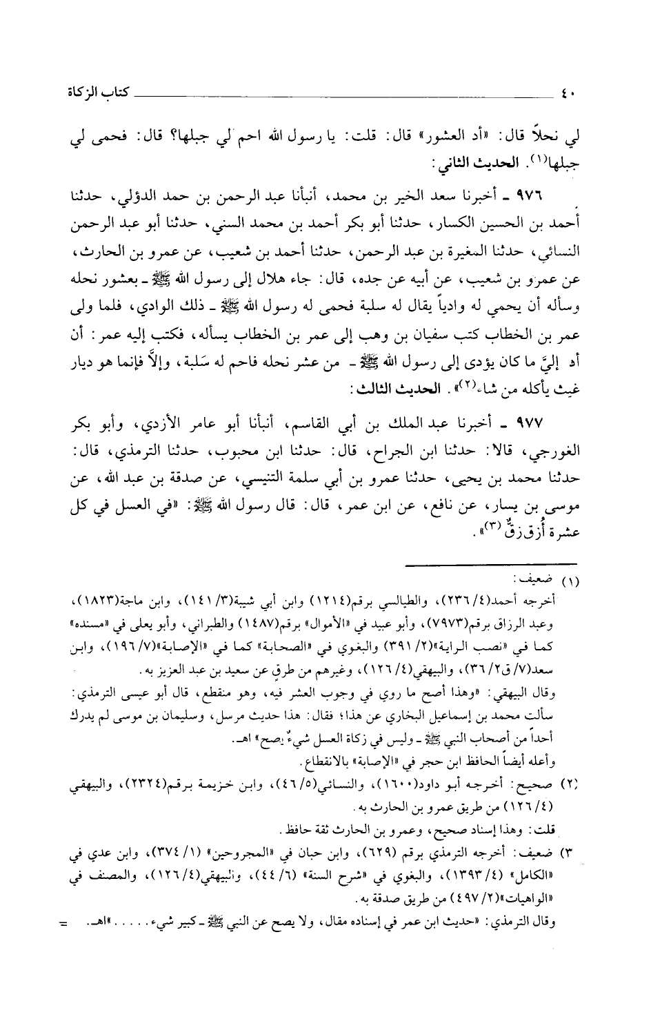 977 - أَخْبَرَنَا عَبْدُ الْمَلِكِ بْنُ أَبِي الْقَاسِمِ أَنْبَأَنَا أَبُو عَامِرٍ الْأَزْدِيّ وأَبُو بَكْرٍ الْغُورَجِيُّ قَالَا حَدَّثَنَا ابْنُ الْجَرَّاحِ قَالَ حَدَّثَنَا ابْنُ مَحْبُوبٍ حَدَّثَنَا التِّرْمِذِيُّ قَالَ حَدَّثَنَا مُحَمَّدُ بن يحيى حَدَّثَنَا عَمْرُو بْنُ أَبِي سَلَمَةَ التِّنِّيسِيُّ عَنْ صَدَقَةَ بْنِ عَبْدِ اللَّهِ عَنْ مُوسَى بْنِ يَسَارٍ عَنْ نَافِعٍ عَنِ ابْنِ عُمَرَ قَالَ قَالَ رَسُولُ اللَّهِ صَلَّى الله عَلَيْهِ وسلم فِي الْعَسَلِ فِي كُلِّ عَشَرَةِ أَزُقٍّ زِقٌّ