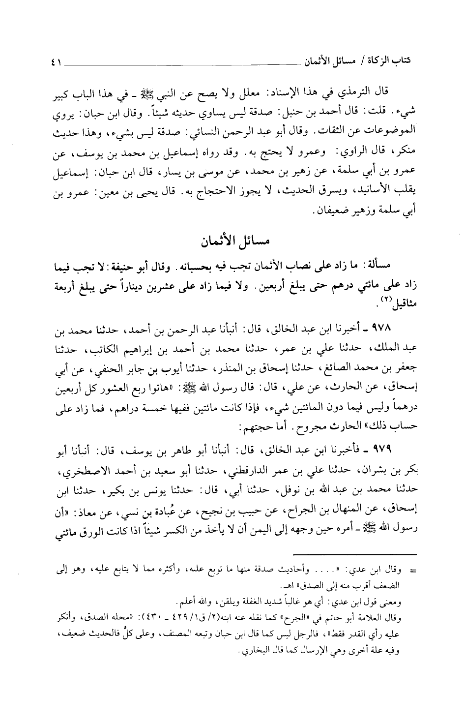 978 - أَخْبَرَنَا ابْنُ عَبْدِ الْخَالِقِ قَالَ أَنْبَأَنَا عَبْدُ الرَّحْمَنِ بْنُ أَحْمَدَ حَدَّثَنَا مُحَمَّدُ بْنُ عَبْدِ الْمَلِكِ حَدَّثَنَا عَلِيُّ بْنُ عُمَرَ حَدَّثَنَا مُحَمَّدُ بْنُ أَحْمد بن إِبْرَاهِيم الْكَاتِب حَدَّثَنَا جَعْفَرُ بْنُ مُحَمَّدٍ الصَّائِغُ حَدثنَا إِسْحَاق بن الْمُنْذر حَدَّثَنَا أَيُّوبُ بْنُ جَابِرٍ الْحَنَفِيُّ عَنْ أَبِي إِسْحَاقَ عَنِ الْحَارِثِ عَنْ عَلِيٍّ قَالَ قَالَ رَسُولُ اللَّهِ صَلَّى اللَّهُ عَلَيْهِ وَسَلَّمَ هاتوا ربع العشور كل أَرْبَعِينَ درهما وَلَيْسَ فَمَا دُونَ الْمِائَتَيْنِ شَيْءٌ فَإِذَا كَانَتْ مِائَتَيْنِ فَفِيهَا خَمْسَةُ دَرَاهِمَ فَمَا زَاد على حِسَابِ ذَلِكَ الْحَارِثُ مَجْرُوحٌ أَمَّا حُجَّتُهُمْ