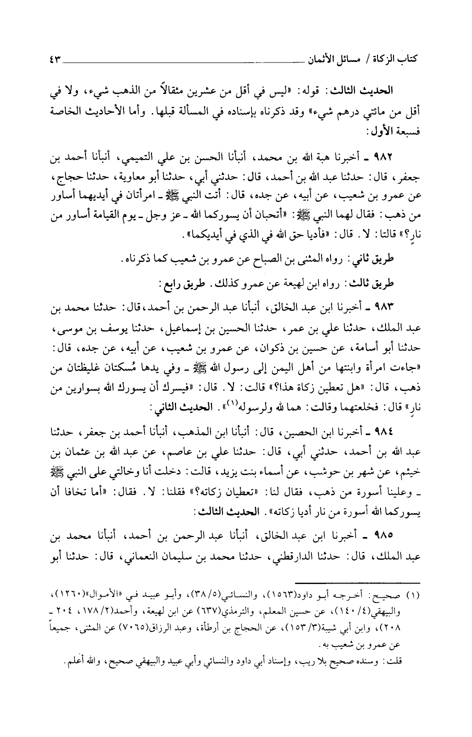982 - أَخْبَرَنَا هِبَةُ اللَّهِ بْنُ مُحَمَّدٍ أَنْبَأَنَا الْحَسَنُ بْنُ عَلِيٍّ التَّمِيمِيُّ أَنْبَأَنَا أَحْمَدُ بْنُ جَعْفَرٍ قَالَ حَدَّثَنَا عَبْدُ اللَّهِ بْنُ أَحْمَدَ قَالَ حَدَّثَنِي أَبِي حَدَّثَنَا أَبُو مُعَاوِيَةَ حَدَّثَنَا حَجَّاجٌ عَنِ عَمْرِو بْنِ شُعَيْبٍ عَنْ أَبِيهِ عَنْ جَدِّهِ قَالَ أَتَتِ النَّبِيَّ صل اللَّهُ عَلَيْهِ وَسَلَّمَ امْرَأَتَانِ فِي أَيْدِيهِمَا أَسَاوِرُ مِنْ ذَهَبٍ فَقَالَ لَهُمَا النَّبِيُّ صَلَّى اللَّهُ عَلَيْهِ وَسَلَّمَ أَتُحِبَّانِ أَنْ يُسَوِّرَكُمَا اللَّهُ عَزَّ وَجَلَّ يَوْمَ الْقِيَامَةِ أَسَاوِرَ مِنْ نَارٍ قَالَتَا لَا قَالَ فَأَدِّيَا حَقَّ اللَّهِ فِي الَّذِي فِي أيديكما