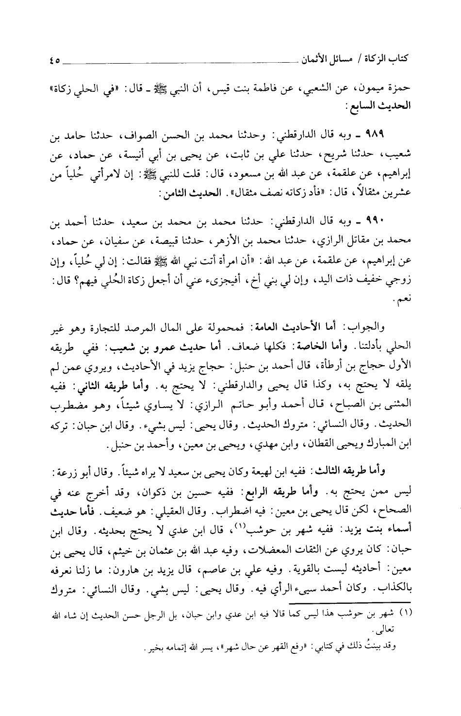 989 - وَبِهِ قَالَ الدَّارَقُطْنِيُّ وَحَدَّثَنَا مُحَمَّدُ بن الْحسن الصَّواف حَدثنَا حَامِد بن شُعَيْب حَدثنَا شُرَيْح حَدَّثَنَا عَلِيُّ بْنُ ثَابِتٍ عَنْ يَحْيَى بْنِ أَبِي أُنَيْسَةَ عَنْ حَمَّادٍ عَنْ إِبْرَاهِيمَ عَنْ عَلْقَمَةَ عَنْ عَبْدِ اللَّهِ بْنِ مَسْعُودٍ قَالَ قُلْتُ لِلنَّبِيِّ صَلَّى اللَّهُ عَلَيْهِ وَسلم إِن لَا مرأتي حُلِيًّا مِنْ عِشْرِينَ مِثْقَالًا قَالَ فَأَدِّ زَكَاتَهُ نِصْفَ مِثْقالٍ الْحَدِيثُ الثَّامِن