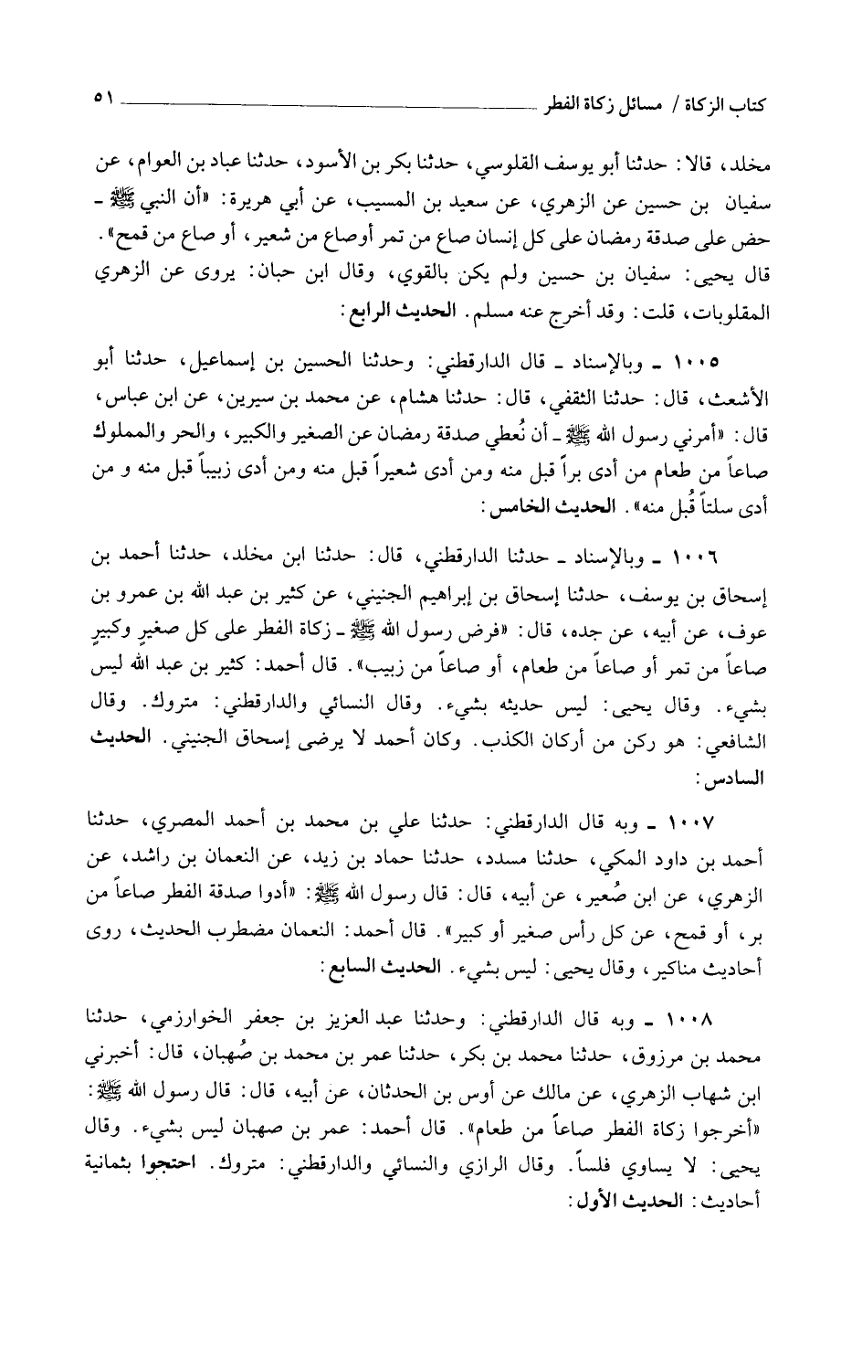 1007 - وَبِهِ قَالَ الدَّارَقُطْنِيُّ حَدَّثَنَا عَلِيُّ بْنُ مُحَمَّدِ بْنِ أَحْمد الْمصْرِيّ حَدثنَا أمد بن داد الْمَكِّيُّ حَدَّثَنَا مُسَدَّدٌ حَدَّثَنَا حَمَّادُ بْنُ زَيْدٍ عَنِ النُّعْمَانَ بْنِ رَاشِدٍ عَنِ الزُّهْرِيِّ عَنِ ابْنِ صعير عَنْ أَبِيهِ قَالَ قَالَ رَسُولُ اللَّهِ صَلَّى اللَّهُ عَلَيْهِ وَسَلَّمَ أَدُّوا صَدَقَةَ الْفِطْرِ صَاعًا مِنْ بُرٍّ أَوْ قَمْحٍ عَنْ كُلِّ رَأْسٍ صَغِيرٍ أَوْ كَبِيرٍ قَالَ أَحْمَدُ النُّعْمَانُ مُضْطَرِبُ الْحَدِيثِ رَوَى أَحَادِيثَ مَنَاكِيرَ وَقَالَ يَحْيَى لَيْسَ بِشَيْءٍ الْحَدِيثُ السَّابِعُ