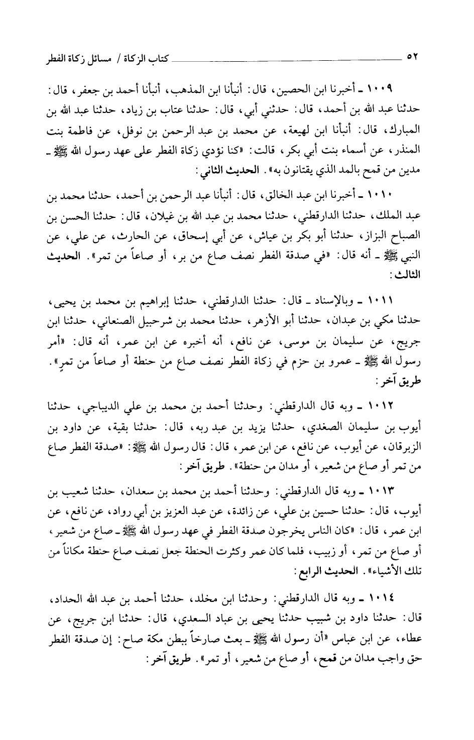 1013 - وَبِهِ قَالَ الدَّارَقُطْنِيُّ وَحَدَّثَنَا أَحْمَدُ بْنُ مُحَمَّدِ بْنِ سَعْدَانَ حَدَّثَنَا شُعَيْبُ بْنُ أَيُّوبَ قَالَ حَدَّثَنَا حُسَيْنُ بْنُ عَلِيٍّ عَنْ زَائِدَةَ عَنْ عَبْدِ الْعَزِيزِ بْنُ أَبِي رَوَّادٍ عَنْ نَافِعٍ عَنِ ابْنِ عُمَرَ قَالَ كَانَ النَّاسُ يُخْرِجُونَ صَدَقَةَ الْفِطْرِ فِي عَهْدِ رَسُولِ اللَّهِ صَلَّى الله عَلَيْهِ وَسلم صَاعٌ مِنْ شَعِيرٍ أَوْ صَاعٌ مِنْ تَمْرٍ أَوْ زَبِيبٍ فَلَمَّا كَانَ عمر وكثرت الْحِنْطَةُ جَعَلَ نِصْفَ صَاعٍ حِنْطَةً مَكَانا مِنْ تِلْكَ الْأَشْيَاءِ الْحَدِيثُ الرَّابِعُ