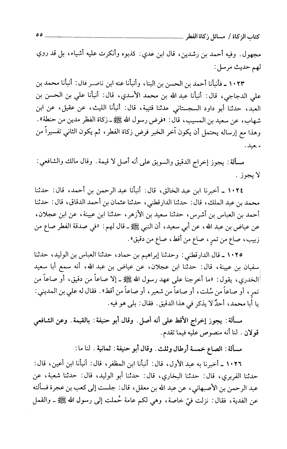 1025 - قَالَ الدَّارَقُطْنِيُّ وَحَدَّثَنَا إِبْرَاهِيمُ بْنُ حَمَّادٍ حَدَّثَنَا الْعَبَّاسُ بْنُ الْوَلِيدِ حَدَّثَنَا سُفْيَانُ بْنُ عُيَيْنَةَ قَالَ حَدَّثَنَا ابْنُ عَجْلَانَ عَنْ عِيَاضِ بْنِ عَبْدِ اللَّهِ أَنَّهُ سَمِعَ أَبَا سَعِيدٍ الْخُدْرِيَّ يَقُولُ مَا أَخْرَجْنَا عَلَى عَهْدِ رَسُولِ اللَّهِ صَلَّى اللَّهُ عَلَيْهِ وَسَلَّمَ أَلَا صَاعًا مِنْ دَقِيقٍ أَوْ صَاعًا مِنْ تَمْرٍ أَوْ صَاعًا مِنْ سُلْتٍ أَوْ صَاعًا مِنْ شَعِيرٍ أَوْ صَاعًا مِنْ أَقْطٍ فَقَالَ لَهُ عَلِيُّ بْنُ الْمَدِينِيِّ يَا أَبَا مُحَمَّدٍ أَحَدٌ لَا يَذْكُرُ فِي هَذَا الدَّقِيق فَقَالَ بَلَى هُوَ فِيهِ