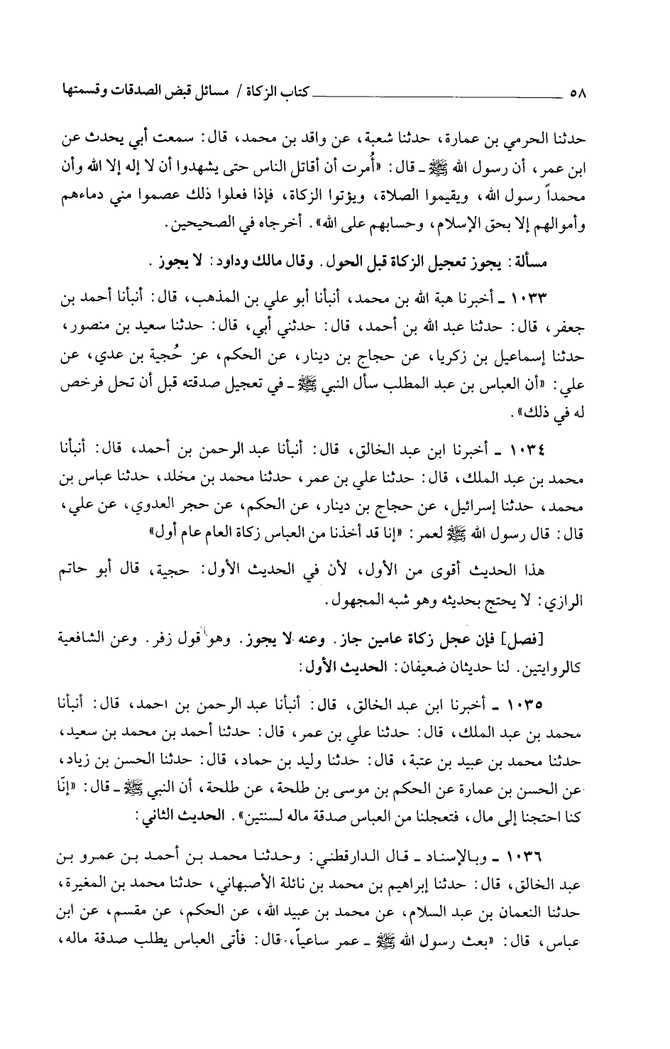 1033 - أَخْبَرَنَا هِبَةُ اللَّهِ بْنُ مُحَمَّدٍ أَنْبَأَنَا أَبُو عَلِيِّ بْنُ الْمُذْهِبِ قَالَ أَنْبَأَنَا أَحْمَدُ بْنُ جَعْفَرٍ قَالَ حَدَّثَنَا عَبْدُ اللَّهِ بْنُ أَحْمَدَ قَالَ حَدَّثَنِي أَبِي قَالَ حَدَّثَنَا سَعِيدُ بْنُ مَنْصُورٍ حَدَّثَنَا إِسْمَاعِيلُ بْنُ زَكَرِيَّا عَنْ حَجَّاجِ بْنِ دِينَارٍ عَنِ الْحَكَمِ بن حُجَيَّةَ بْنِ عَدِيٍّ عَنْ عَلِيٍّ أَنَّ الْعَبَّاسَ بْنَ عَبْدِ الْمُطَّلِبِ سَأَلَ النَّبِيَّ صَلَّى اللَّهُ عَلَيْهِ وَسَلَّمَ فِي تَعْجِيلِ صَدَقَتِهِ قَبْلَ أَنْ تَحِلَّ فَرَخَّصَ لَهُ فِي ذَلِكَ
