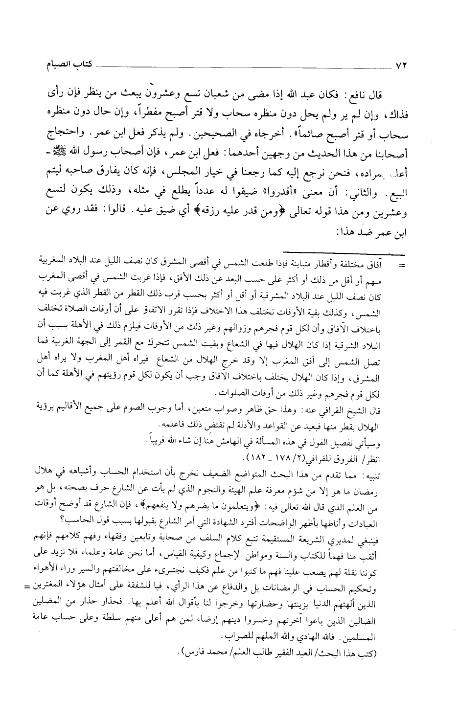 قَالَ نَافِعٌ فَكَانَ عَبْدُ اللَّهِ إِذَا مَضَى مِنْ شَعْبَانَ تِسْعٌ وَعِشْرُونَ يبْعَث مِنْ يَنْظُرُ فَإِنْ رَأَى فَذَاكَ وإِن لَمْ يَرَ وَلَمْ يَحُلْ دُونَ مَنْظَرِهِ سَحَابٌ وَلَا قَتَرٌ أَصْبَحَ مُفطرا وإِن حَالَ دُونَ مَنْظَرِهِ سَحَابٌ أَوْ قَتَرٌ أَصْبَحَ صَائِمًا أَخْرَجَاهُ فِي الصَّحِيحَيْنِ وَلم يذكر فِعْلَ ابْنِ عُمَرَ وَاحْتِجَاجُ أَصْحَابِنَا مِنْ هَذَا الْحَدِيثِ مِنْ وَجْهَيْنِ أَحَدْهُمَا فِعْلُ ابْنِ عُمَرَ فَإِنَّ أَصْحَابِ رَسُولِ اللَّهِ صَلَّى اللَّهُ عَلَيْهِ وَسَلَّمَ أَعْلَمُ بِمُرَادِهِ فَنَحْنُ نَرْجِعُ إِلَيْهِ كَمَا رَجَعْنَا فِي خِيَارِ الْمَجْلِسِ فَإِنَّهُ كَانَ يُفَارِقُ صَاحِبَهُ لِيُتِمَّ الْبَيْعَ وَالثَّانِي أَنَّ مَعْنَى اقْدِرُوا ضَيِّقُوا لَهُ عَدَدًا يَطْلُعُ فِي مِثْلِهِ وَذَلِكَ يَكُونُ لِتِسْعٍ وَعِشْرِينَ وَمِنْ هَذَا قَوْلُهُ تَعَالَى {ومَنْ قُدِرَ عَلَيْهِ رِزْقُهُ} أَي ضيق عَلَيْهِ قالو فَقَدْ رُوِيَ عَنِ ابْنِ عُمَرَ ضِدَّ هَذَا