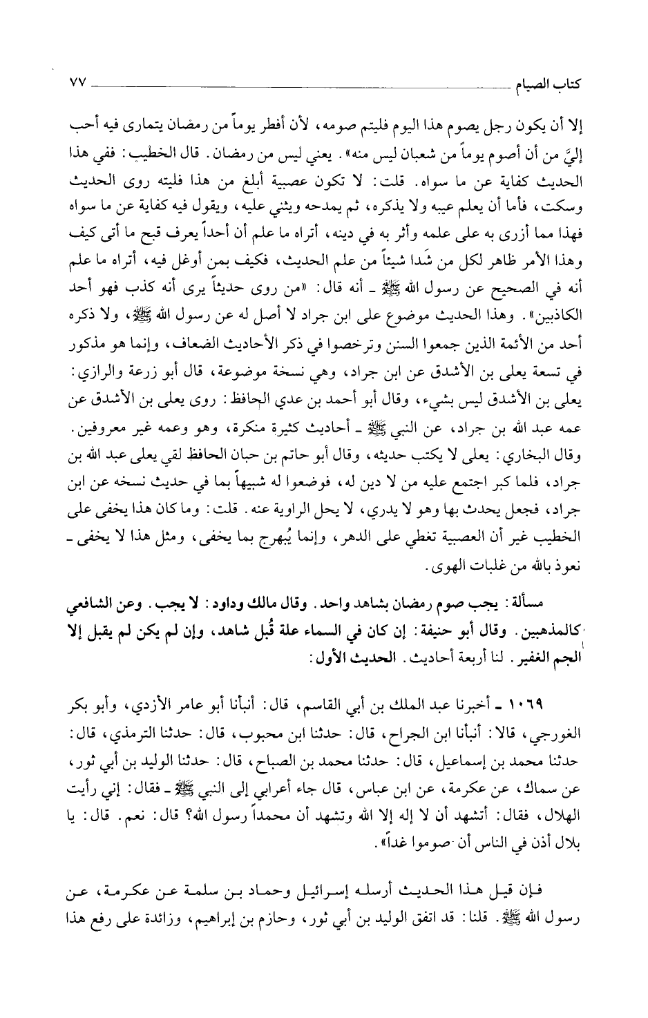 إِلَّا أَنْ يَكُونَ رَجُلٌ يَصُومُ هَذَا الْيَومَ فَلْيُتِمَّ صَوْمَهُ لَأَنْ أُفْطِرَ يَوْمًا مِنْ رَمَضَانَ يُتَمَارَى فِيهِ أَحَبُّ إِلَيَّ مِنْ أَنْ أَصُومَ يَوْمًا مِنْ شَعْبَانَ لَيْسَ مِنْهُ يَعْنِي لَيْسَ مِنْ رَمَضَانَ قَالَ الْخَطِيبُ فَفِي هَذَا الْحَدِيثُ كِفَايَةٌ عَنْ مَا سِوَاهُ قُلْتُ لَا تَكُونُ عَصَبِيَّةٌ أَبْلَغُ مِنْ هَذَا فَلَيْتَهُ رَوَى الْحَدِيثَ وَسَكَتَ فَأَمَّا أَنْ يَعْلَمَ عَيْبَهُ وَلَا يَذْكُرُهُ ثُمَّ يَمْدَحُهُ وَيُثْنِي عَلَيْهِ وَيَقُولُ فِيهِ كِفَايَةٌ عَنْ مَا سِوَاهُ فَهَذَا مِمَّا أَزْرَى بِهِ عَلَى عِلْمِهِ وَأَثَرَ بِهِ فِي دِينِهِ أَتُرَاهُ مَا عَلِمَ أَنَّ أَحَدًا يَعْرِفُ قُبْحَ مَا أَتَى كَيْفَ وَهَذَا الْأَمْرُ ظَاهِرٌ لِكُلِّ من شدا شَيْئًا مِنْ عِلْمِ الْحَدِيثِ فَكَيْفَ بِمَنْ أَوْغَلَ فِيهِ أَتُرَاهُ مَا عَلِمَ أَنَّهُ فِي الصَّحِيحِ عَنْ رَسُولُ اللَّهِ صَلَّى اللَّهُ عَلَيْهِ وَسَلَّمَ أَنَّهُ قَالَ مَنْ رَوَى حَدِيثًا يَرَى أَنَّهُ كَذِبٌ فَهُوَ أَحَدُ الْكَاذِبِينَ وَهَذَا الْحَدِيثُ مَوْضُوعٌ عَلَى ابْنِ جَرَادٍ لَا أَصْلَ لَهُ عَنْ رَسُولِ اللَّهِ صَلَّى اللَّهُ عَلَيْهِ وَسَلَّمَ وَلَا ذَكَرَهُ أَحَدٌ مِنَ الْأَئِمَّةِ الَّذِينَ جَمَعُوا السُّنَنَ وَتَرَخَّصُوا فِي ذِكْرِ الْأَحَادِيثِ الضِّعَافِ وَإِنَّمَا هُوَ مَذْكُورٌ فِي تِسْعَة يَعْلَى بْنِ الْأَشْدَقِ عَنِ ابْنِ جَرَادٍ وَهِيَ نُسْخَةٌ مَوْضُوعَةٌ قَالَ أَبُو زرْعَة والرازي يَعْلَى بْنُ الْأَشْدَقِ لَيْسَ بِشَيْءٍ وَقَالَ أَبُو أَحْمَدَ بْنُ عَدِيٍّ الْحَافِظ ورى يَعْلَى بْنُ الْأَشْدَقِ عَنْ عَمِّهِ عَبْدِ اللَّهِ بْنِ جَرَادٍ عَنِ النَّبِيَّ صَلَّى اللَّهُ عَلَيْهِ وَسَلَّمَ أَحَادِيثَ كَثِيرَةً مُنْكَرَةً وَهُوَ وَعَمُّهُ غَيْرُ مَعْرُوفَيْنِ وَقَالَ الْبُخَارِيُّ يَعْلَى لايكتب حَدِيثُهُ وقَالَ أَبُو حَاتِمِ بْنُ حِبَّانَ الْحَافِظُ لَقِيَ يَعْلَى عَبْدَ اللَّهِ بْنَ جَرَادٍ فَلَمَّا كَبِرَ اجْتَمَعَ عَلَيْهِ مَنْ لَا دِينَ لَهُ فوضعوا لَهُ شَبِيها بِمَا فِي حَدِيثٍ نُسْخَةً عَنِ ابْنِ جَرَادٍ فَجَعَلَ يُحَدِّثُ بِهَا وَهُوَ لَا يدْرِي لَا يحل الرِّوَايَة عَنهُ قلت ومَا كَانَ هَذَا يَخْفَى عَلَى الْخَطِيبِ غَيْرَ أَنَّ الْعَصَبِيَّةَ تُغَطِّي عَلَى الدَّهْر وَإِنَّمَا يبهرج بِمَا يَخْفَى وَمِثْلُ هَذَا لَا يَخْفَى نَعُوذُ بِاللَّهِ مِنْ غَلَبَاتِ الْهوى