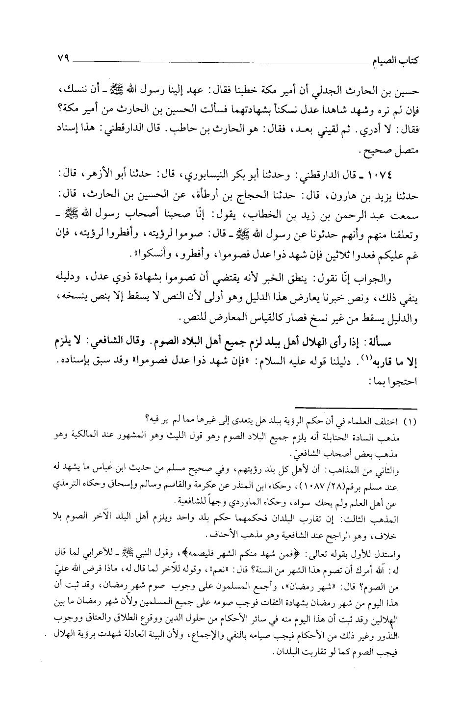 1074 - قَالَ الدَّارَقُطْنِيُّ وَحَدَّثَنَا أَبُو بَكْرٍ النَّيْسَابُورِيُّ قَالَ حَدَّثَنَا أَبُو الْأَزْهَرِ قَالَ حَدَّثَنَا يَزِيدُ بْنُ هَارُونَ قَالَ حَدَّثَنَا الْحَجَّاجُ بْنُ أَرْطَأَةَ عَنِ الْحُسَيْنِ بْنِ الْحَارِثِ قَالَ سَمِعْتُ عَبْدُ الرَّحْمَنِ بْنُ زَيْدِ بْنِ الْخَطَّابِ يَقُولُ إِنَّا صَحَبْنَا أَصْحَابَ رَسُولِ اللَّهِ صَلَّى اللَّهُ عَلَيْهِ وَسَلَّمَ وَتَعَلَّقْنَا مِنْهُمْ وأَنهم حَدَّثُونَا عَنْ رَسُولِ اللَّهِ صَلَّى اللَّهُ عَلَيْهِ وَسَلَّمَ قَالَ صُومُوا لرُؤْيَته وأفطروا لِرُؤْيَتِهِ فَإِنْ غُمَّ عَلَيْكُمْ فَعُدُّوا ثَلَاثِينَ فَإِنْ شَهِدَ ذَوَا عَدْلٍ فصوموا وأفطروا وأنسكوا