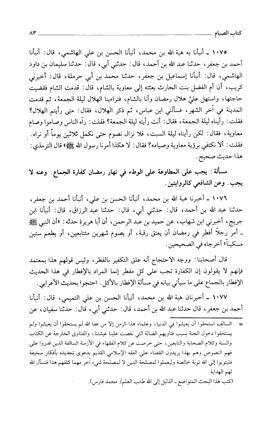 1075 - أَنْبَأَنَا بِهِ هِبَةُ اللَّهِ بْنُ مُحَمَّدٍ أَنْبَأَنَا الْحَسَنُ بْنُ عَلِيٍّ الْهَاشِمِيُّ قَالَ أَنْبَأَنَا أَحْمَدُ بْنُ جَعْفَرٍ حَدَّثَنَا عَبْدُ اللَّهِ بْنُ أَحْمَدَ قَالَ حَدَّثَنِي أَبِي قَالَ حَدَّثَنَا سُلَيْمَانُ بْنُ دَاوُدَ الْهَاشِمِيُّ قَالَ أَنْبَأَنَا إِسْمَاعِيلُ بْنُ جَعْفَرٍ حَدَّثَنَا مُحَمَّدُ بْنُ أَبِي حَرْمَلَةَ قَالَ أَخْبَرَنِي كُرَيْبٌ أَنَّ أُمَّ الْفَضْلِ بِنْتَ الْحَارِثِ بَعَثَتْهُ إِلَى مُعَاوِيَةَ بِالشَّامِ قَالَ قَدِمْتُ الشَّامَ فَقَضَيْتُ حَاجَتَهَا وَاسْتَهَلَّ عَلَيَّ هِلَالُ رَمَضَانَ وَأَنَا بِالشَّامِ فَتَرَاءَيْنَا الْهَلِالَ لَيْلَةَ الْجُمُعَةِ ثُمَّ قَدِمْتُ الْمَدِينَةَ فِي آخِرِ الشَّهْرِ فَسَأَلَنِي ابْنُ عَبَّاسٍ ثُمَّ ذَكَرَ الْهِلَالَ فَقَالَ مَتَى رَأَيْتُمُ الْهِلَالَ فَقُلْتُ رَأَيْنَاهُ لَيْلَةَ الْجُمُعَةِ فَقَالَ أَنْتَ رَأَيْتَهُ لَيْلَةَ الْجُمُعَةِ فَقُلْتُ رَآهُ النَّاسُ وَصَامُوا وَصَامَ مُعَاوِيَةُ فَقَالَ لَكِنْ رَأَيْنَاهُ لَيْلَةَ السَّبْتِ فَلَا نَزَالُ نَصُومُ حَتَّى نُكْمِلَ ثَلَاثِينَ يَوْمًا أَو نرَاهُ فَقلت أَلا نكتفي بِرُؤْيَةِ مُعَاوِيَةَ وَصِيَامِهِ فَقَالَ لَا هَكَذَا أَمَرَنَا رَسُولُ اللَّهِ صَلَّى اللَّهُ عَلَيْهِ وَسَلَّمَ قَالَ التِّرْمِذِيُّ هَذَا حَدِيثٌ صَحِيحٌ