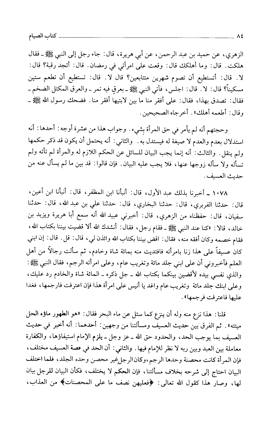 1078 - أَخْبَرَنَا بِذَلِكَ عَبْدُ الْأَوَّلِ قَالَ أَنْبَأَنَا ابْنُ الْمُظَفَّرِ قَالَ أَنْبَأَنَا ابْنُ أَعْيَنَ قَالَ حَدَّثَنَا الْفِرَبْرِيُّ قَالَ حَدَّثَنَا الْبُخَارِيُّ قَالَ حَدَّثَنَا عَلِيُّ بْنُ عَبْدِ اللَّهِ قَالَ حَدَّثَنَا سُفْيَانُ قَالَ حَفِظْنَاهُ مِنِ الزُّهْرِيُّ قَالَ أَخْبَرَنِي عُبَيْدُ اللَّهِ أَنَّهُ سَمِعَ أَبَا هُرَيْرَةَ وَيَزِيدَ بْنَ خَالِدٍ قَالَا كُنَّا عِنْدَ النَّبِيِّ صَلَّى اللَّهُ عَلَيْهِ وَسَلَّمَ فَقَامَ رَجُلٌ فَقَالَ أُنْشُدُكَ اللَّهَ أَلَا قَضَيْتَ بَيْنَنَا بِكِتَابِ اللَّهِ فَقَامَ خَصْمُهُ وَكَانَ أَفْقَهُ مِنْهُ فَقَالَ اقْضِ بَيْنَنَا بِكِتَابِ اللَّهِ وَائْذَنْ لِي قَالَ قُلْ قَالَ إِنَّ ابْنِي كَانَ عسيفا عى هَذَا زنا بامرأته فَافْتَدَيْت مِنْهُ بِمِائَةِ شَاةٍ وَخَادِمٍ ثُمَّ سَأَلت رجَالًا مِنْ أَهْلِ الْعِلْمِ فَأَخْبَرُونِي أَنَّ عَلَى ابْنِي جَلْدُ مِائَةٍ وَتَغْرِيبُ عَام وعلى امْرَأَتِهِ الرَّجْمُ فَقَالَ النَّبِيُّ صَلَّى اللَّهُ عَلَيْهِ وَسَلَّمَ وَالَّذِي نَفْسِي بِيَدِهِ لَأَقْضِيَنَّ بَيْنَكُمَا بِكِتَابِ اللَّهِ جلّ ذكره الْمِائَة شَاة والْخَادِم رَدٌّ عَلَيْكَ وَعَلَى ابْنِكَ جَلْدُ مِائَةٍ وَتَغْرِيبُ عَامٍ وَاغْدُ يَا أُنَيْسُ عَلَى امْرَأَةِ هَذَا فَإِنِ اعْتَرَفَتْ فَارْجُمْهَا فَغَدا عَلَيْهَا فَاعْتَرَفَتْ فرجمها