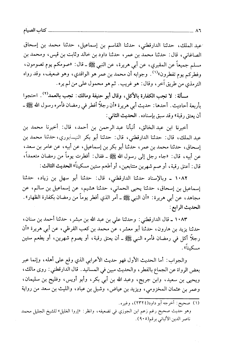 عَبْدِ الْمَلِكِ حَدَّثَنَا الدَّارَقُطْنِيُّ حَدَّثَنَا الْقَاسِمُ بْنُ إِسْمَاعِيلَ حَدَّثَنَا مُحَمَّدُ بْنُ إِسْحَاقَ الصَّاغَانِيُّ قَالَ حَدَّثَنَا مُحَمَّدُ بْنُ عُمَرَ حَدَّثَنَا دَاوُدُ بن خَالِد وثَابت بْنُ قَيْسٍ وَمُحَمَّدُ بْنُ مُسْلِمٍ جَمِيعًا عَنِ الْمَقْبُرِيِّ عَنْ أَبِي هُرَيْرَةَ عَنِ النَّبِيِّ صَلَّى اللَّهُ عَلَيْهِ وَسَلَّمَ قَالَ صَوْمُكُمْ يَوْمَ تَصُومُونَ وَفِطْرُكُمْ يَوْمَ تَفْطُرُونَ وَجَوَابُهُ أَنَّ مُحَمَّدَ بْنَ عُمَرَ هُوَ الْوَاقِدِيُّ وَهُوَ ضَعِيفٌ وَقَدْ رَوَاهُ التِّرْمِذِيُّ مِنْ طَرِيقٍ آخَرَ وَقَالَ هُوَ غَرِيبٌ ثُمَّ هُوَ مَحْمُولٌ عَلَى مَنْ لَمْ يَرَهُ