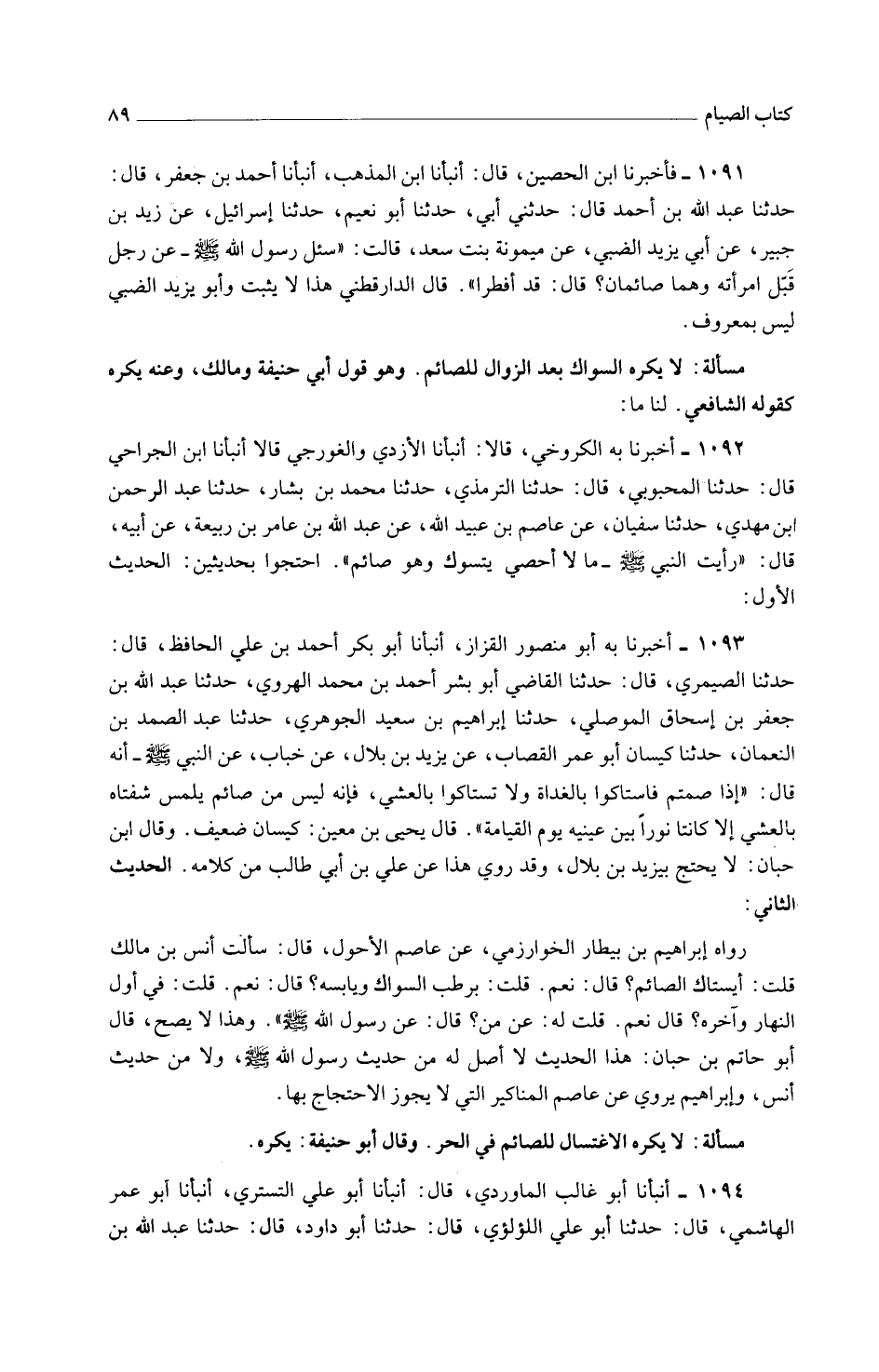 1092 - أَخْبَرَنَا بِهِ الكروخي قَالَا أَنْبَأَنَا الْأَزْدِيُّ وَالْغُورَجِيُّ قَالَا أَنْبَأَنَا ابْن الْجَرَّاحِيُّ قَالَ حَدَّثَنَا الْمَحْبُوبِيُّ قَالَ حَدَّثَنَا التِّرْمِذِيُّ حَدَّثَنَا مُحَمَّدُ بْنُ بشار حَدثنَا عبد الرَّحْمَن ابْن مَهْدِيٍّ حَدَّثَنَا سُفْيَانُ عَنْ عَاصِمِ بْنِ عُبَيْدِ اللَّهِ عَنْ عَبْدِ اللَّهِ بْنِ عَامِرِ بْنِ رَبِيعَةَ عَنْ أَبِيهِ قَالَ رَأَيْتُ النَّبِيَّ صَلَّى اللَّهُ عَلَيْهِ وَسَلَّمَ مَا لَا أُحْصِي يَتَسَوَّكُ وَهُوَ صَائِمٌ احْتَجُّوا بِحَدِيثَيْنِ الْحَدِيثُ الْأَوَّلُ