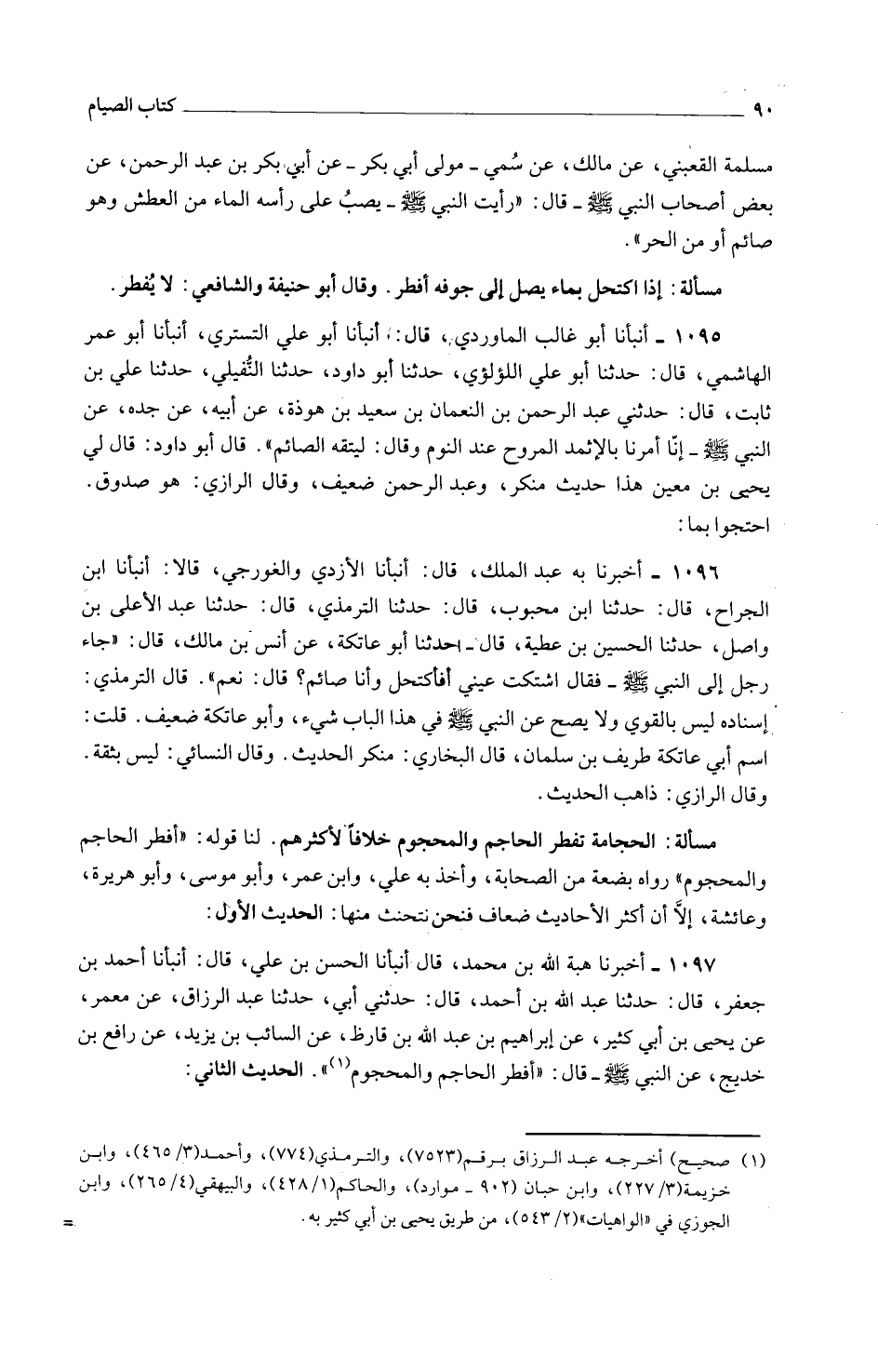 مَسْأَلَةٌ الْحِجَامَةُ تُفْطِرُ الْحَاجِمَ وَالْمَحْجُومَ خِلَافًا لِأَكْثَرِهِمْ لَنَا قَوْلُهُ أَفْطَرَ الْحَاجِمُ وَالْمَحْجُومُ رَوَاهُ بضعَة من الصَّحَابَة وَأَخَذَ بِهِ عَلِيٌّ وَابْنُ عُمَرَ وَأَبُو مُوسَى وَأَبُو هُرَيْرَةَ وَعَائِشَةُ إِلَّا أَنَّ أَكْثَرَ الْأَحَادِيثِ ضِعَافٌ فَنحْن نتحنث مِنْهَا الْحَدِيثُ الْأَوَّلُ