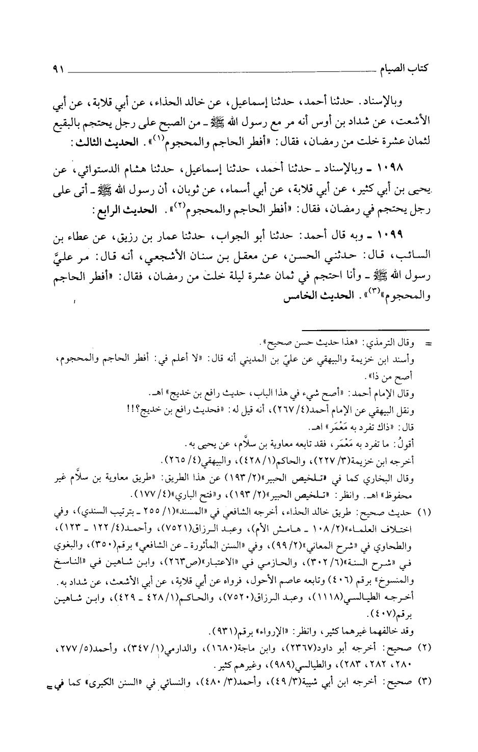 1098 - وَبِالْإِسْنَادِ حَدَّثَنَا أَحْمَدُ حَدَّثَنَا إِسْمَاعِيلُ حَدَّثَنَا هِشَامٌ الدِّسْتُوَائِيُّ عَنْ يَحْيَى بْنِ أَبِي كَثِيرٍ عَنْ أَبِي قِلَابَةَ عَنْ أَبِي أَسْمَاءَ عَنْ ثَوْبَانَ أَنّ رَسُولَ اللَّهِ صَلَّى اللَّهُ عَلَيْهِ وَسَلَّمَ أَتَى عَلَى رَجُلٍ يَحْتَجِمُ فِي رَمَضَانَ فَقَالَ أَفْطَرَ الْحَاجِمُ وَالْمَحْجُومُ الْحَدِيثُ الرَّابِعُ