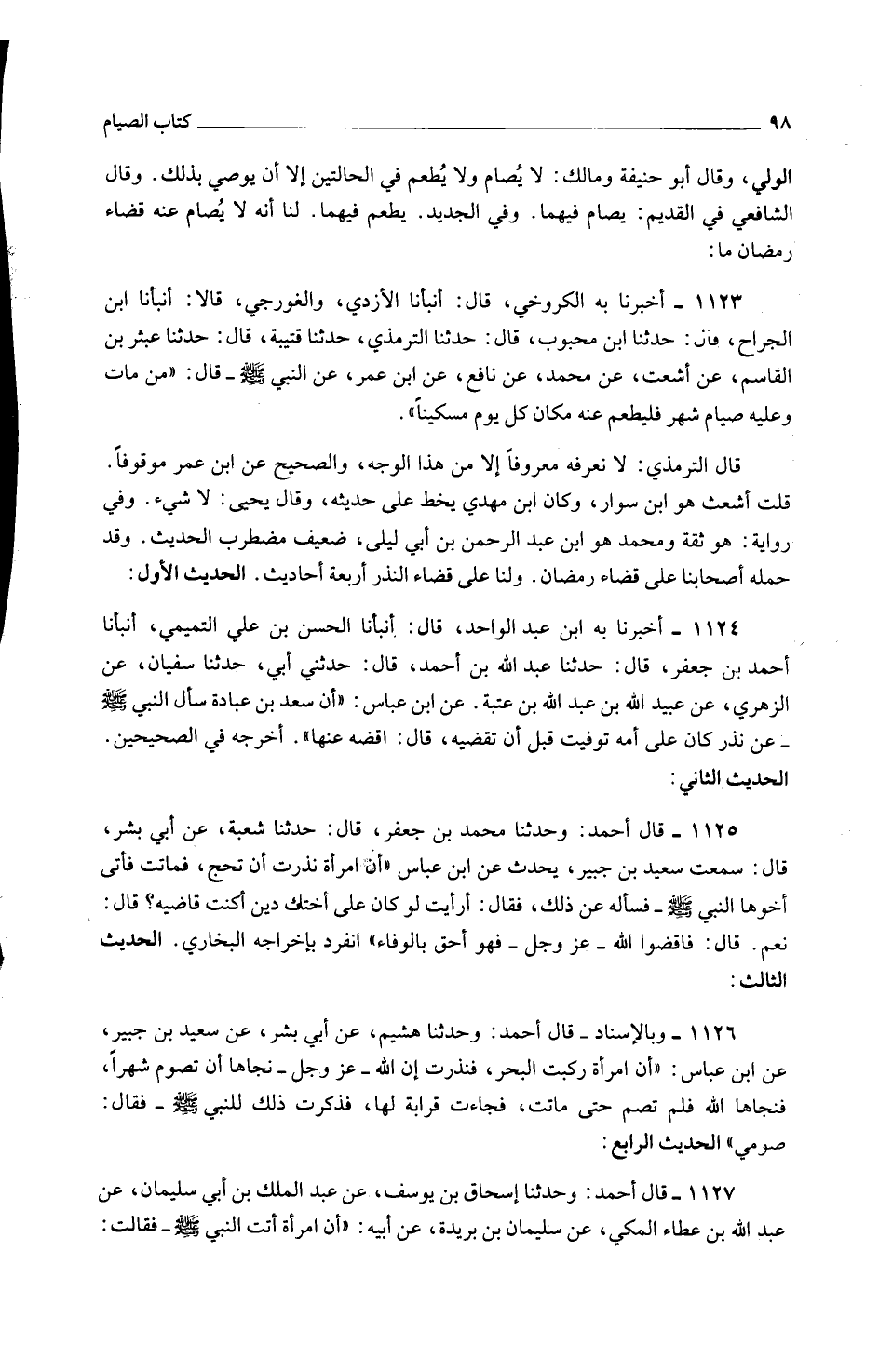1126 - وَبِالْإِسْنَادِ قَالَ أَحْمَدُ وَحَدَّثَنَا هُشَيْمٌ عَنْ أَبِي بِشْرٍ عَنْ سَعِيدِ بْنِ جُبَيْرٍ عَنِ ابْنِ عَبَّاسٍ أَنَّ امْرَأَةً رَكِبَتِ الْبَحْرِ فَنَذَرَتْ إِنِ اللَّهُ عَزَّ وَجَلَّ نَجَّاهَا أَنْ تَصُومَ شَهْرًا فَنَجَّاهَا اللَّهُ فَلَمْ تَصُمْ حَتَّى مَاتَتْ فَجَاءَتْ قِرَابَةٌ لَهَا فَذَكَرَتْ ذَلِكَ لِلنَّبِيِّ صَلَّى اللَّهُ عَلَيْهِ وَسَلَّمَ فَقَالَ صُومِي الْحَدِيثُ الرَّابِعُ
